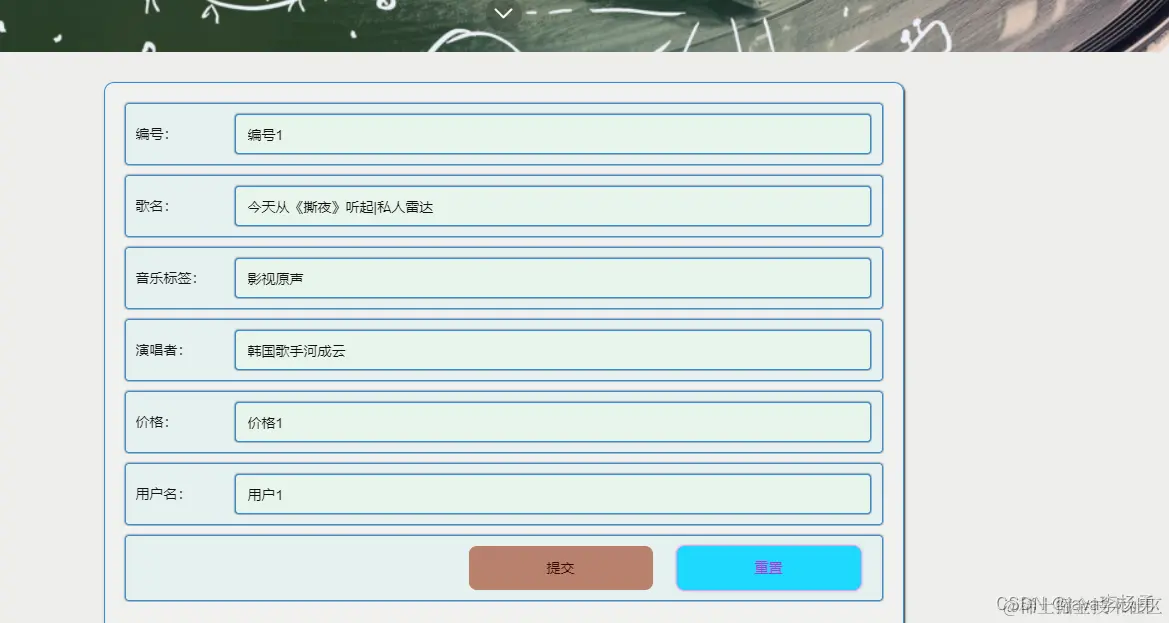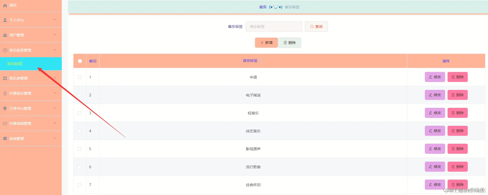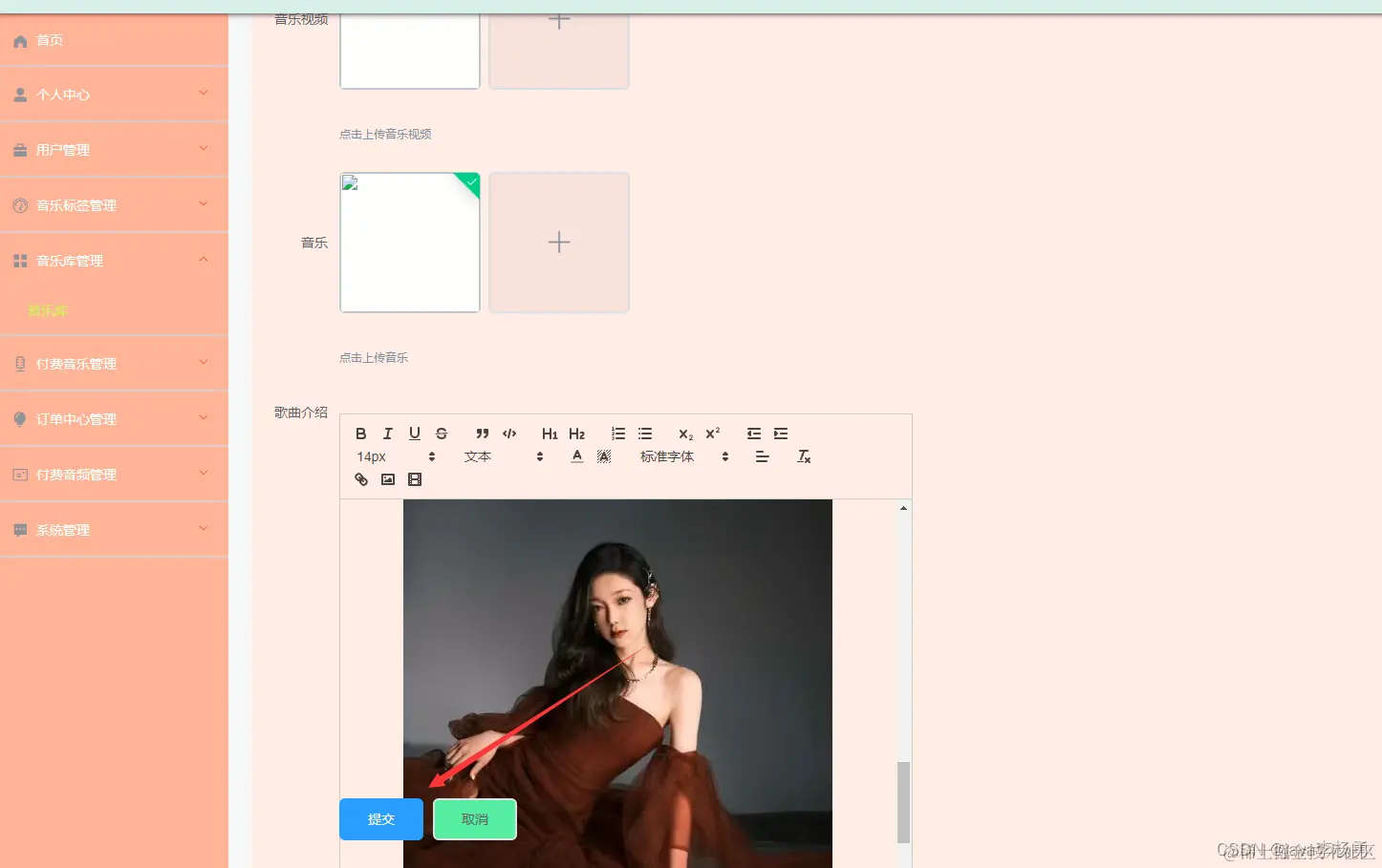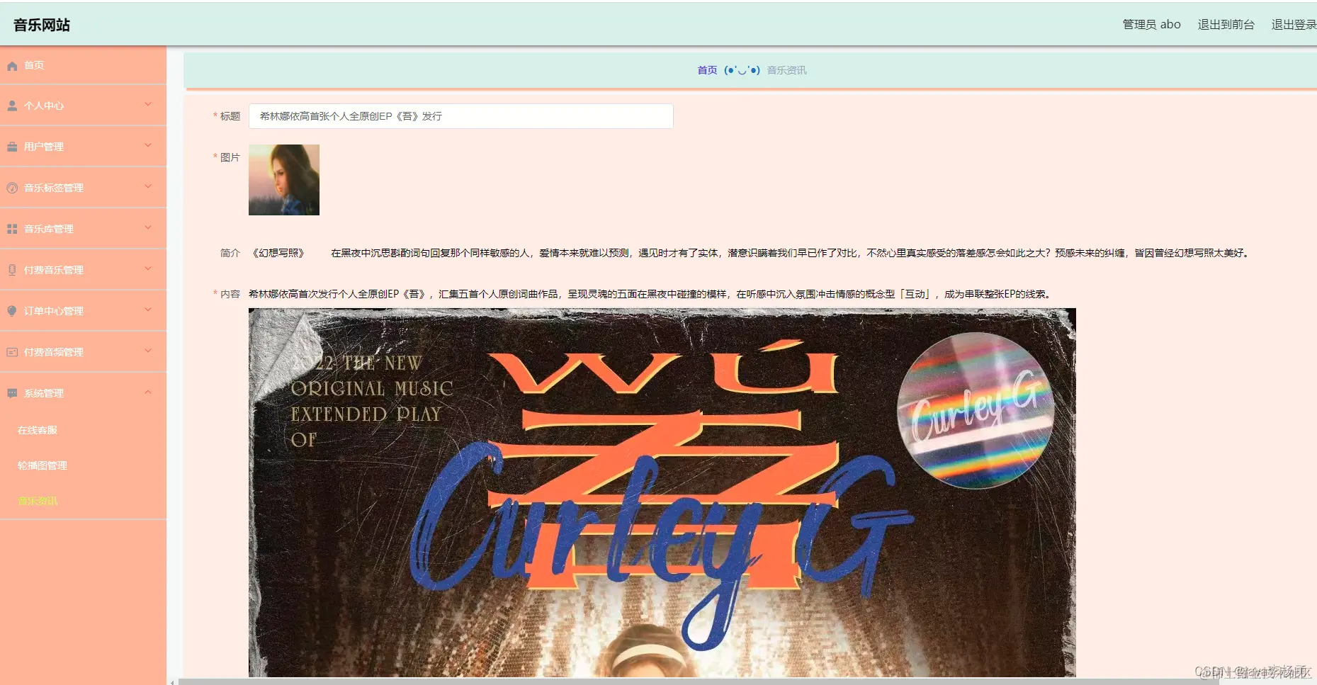 音乐库管理,通过内容列表获取编号、歌名、音乐标签、图片、演唱者、作曲、作词、音乐视频、音乐等信息可进行详情、修改、删除或查看操作
