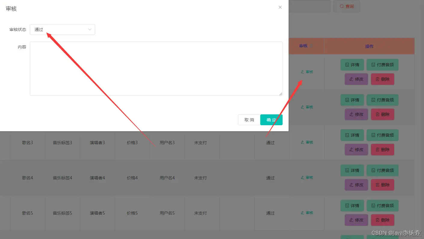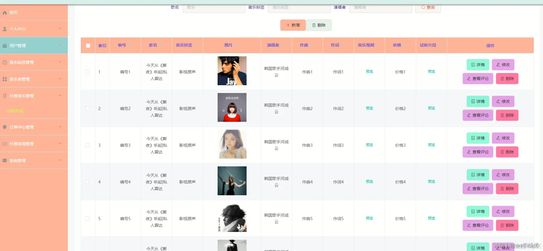 付费音乐管理,通过内容列表可以查看编号、歌名、音乐标签、图片、演唱者、作曲、作词、音乐视频、价格、试听片段等可以进行点赞、评论、购买等操作