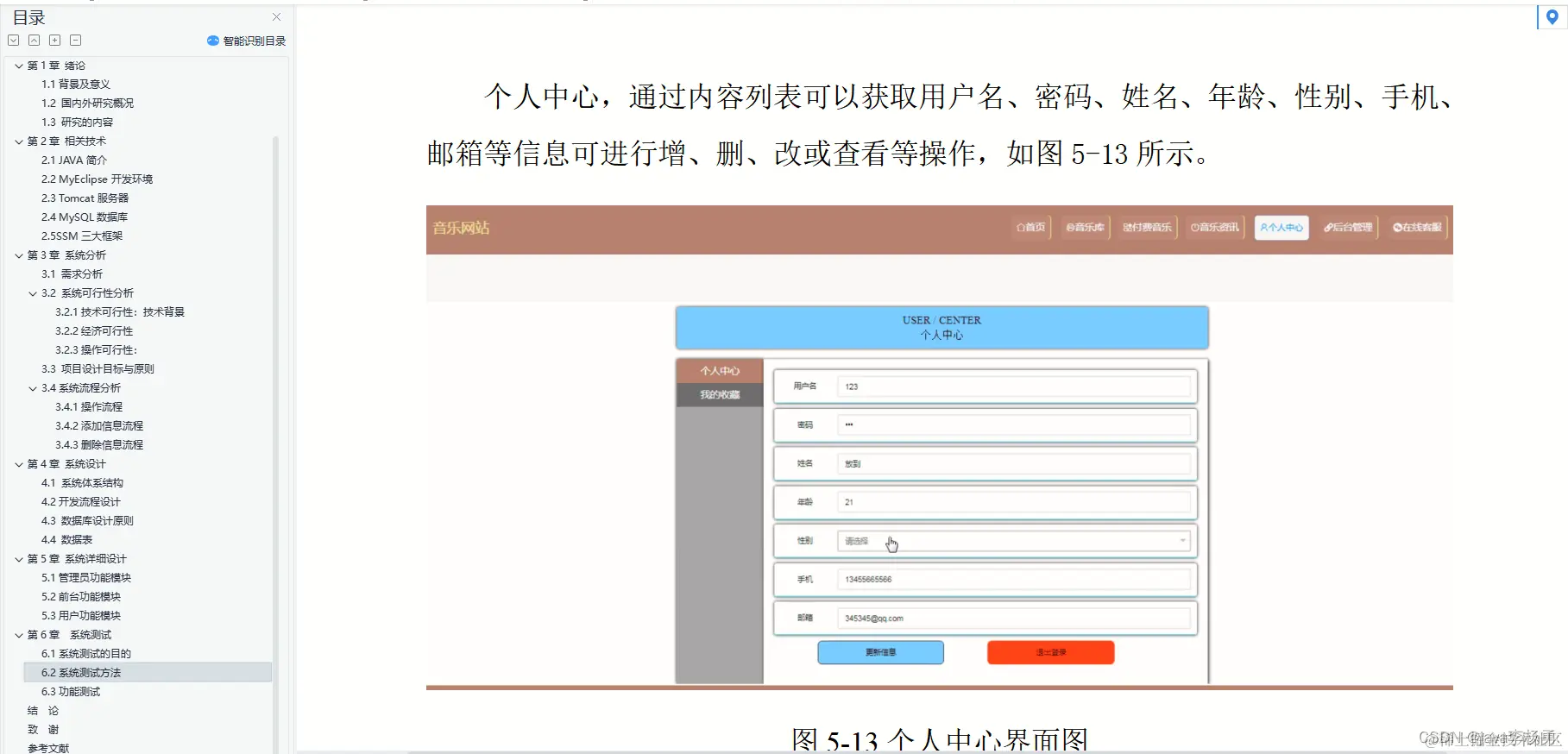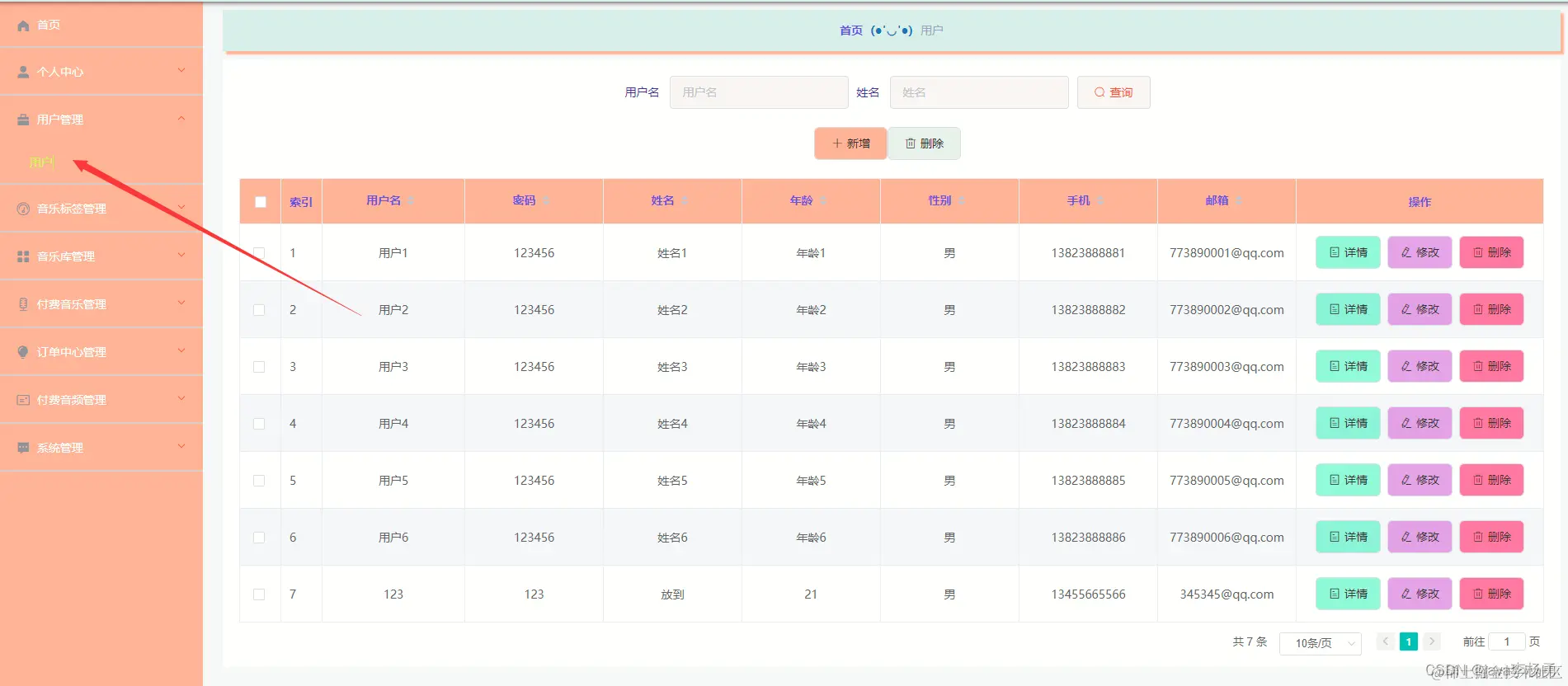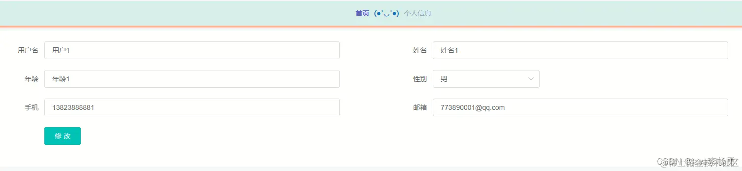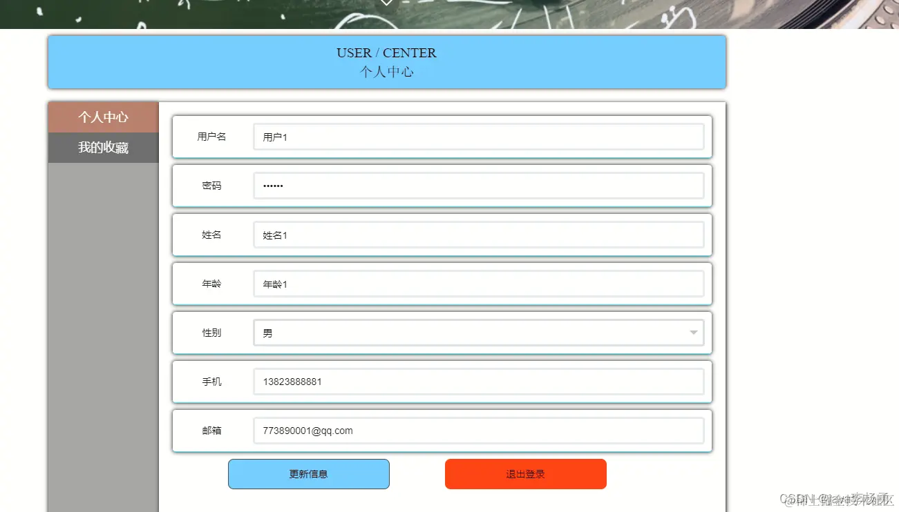 个人中心,通过内容列表可以获取用户名、密码、姓名、年龄、性别、手机、邮箱等信息可进行增、删、改或查看等操作