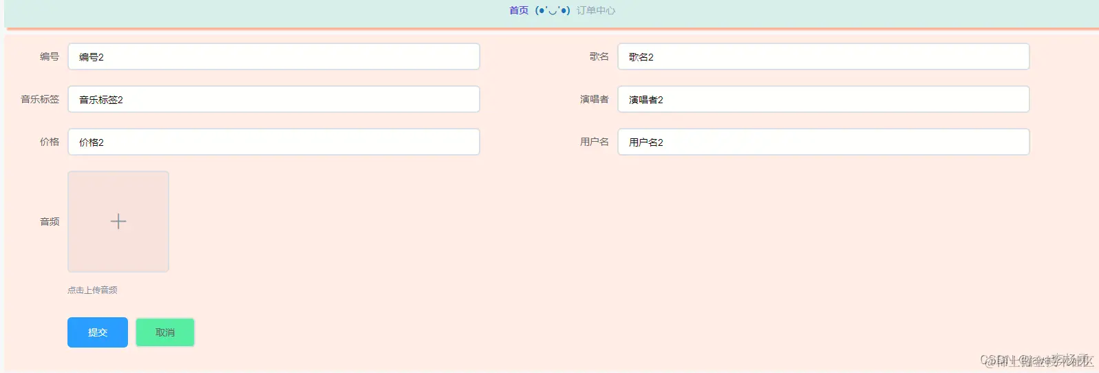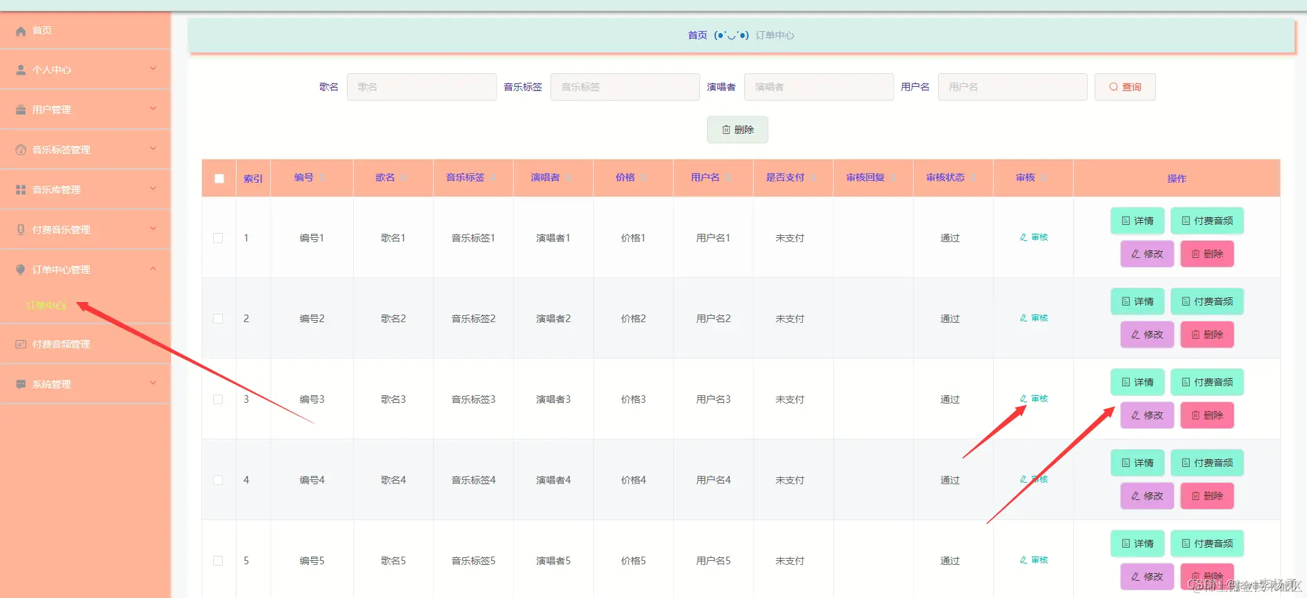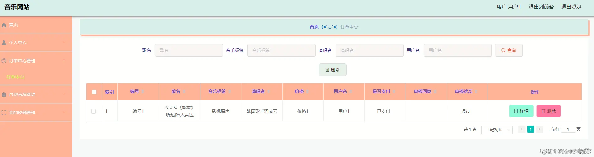 订单中心管理,在订单中心管理页面可以查看编号、歌名、音乐标签、演唱者、价格、用户名、是否支付、审核回复、审核、支付以及查看详情