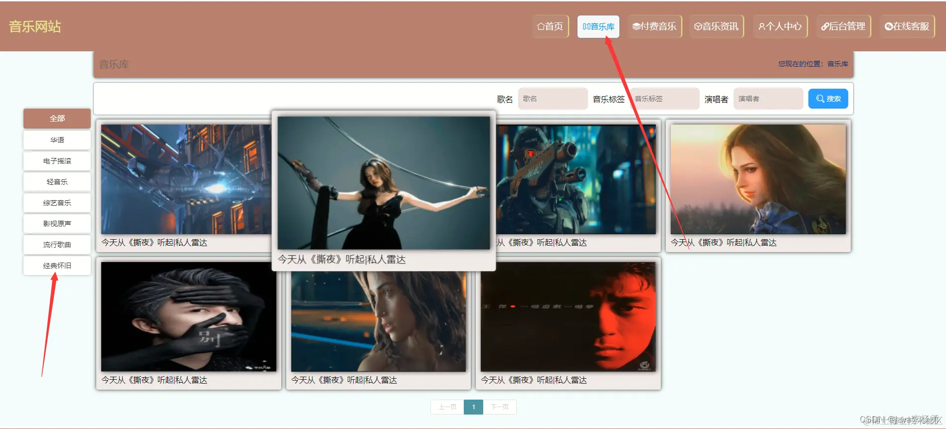 前台首页浏览,通过内容列表可以获取网站首页、音乐库、音乐资讯、个人中心、后台管理、在线客服等信息操作内容