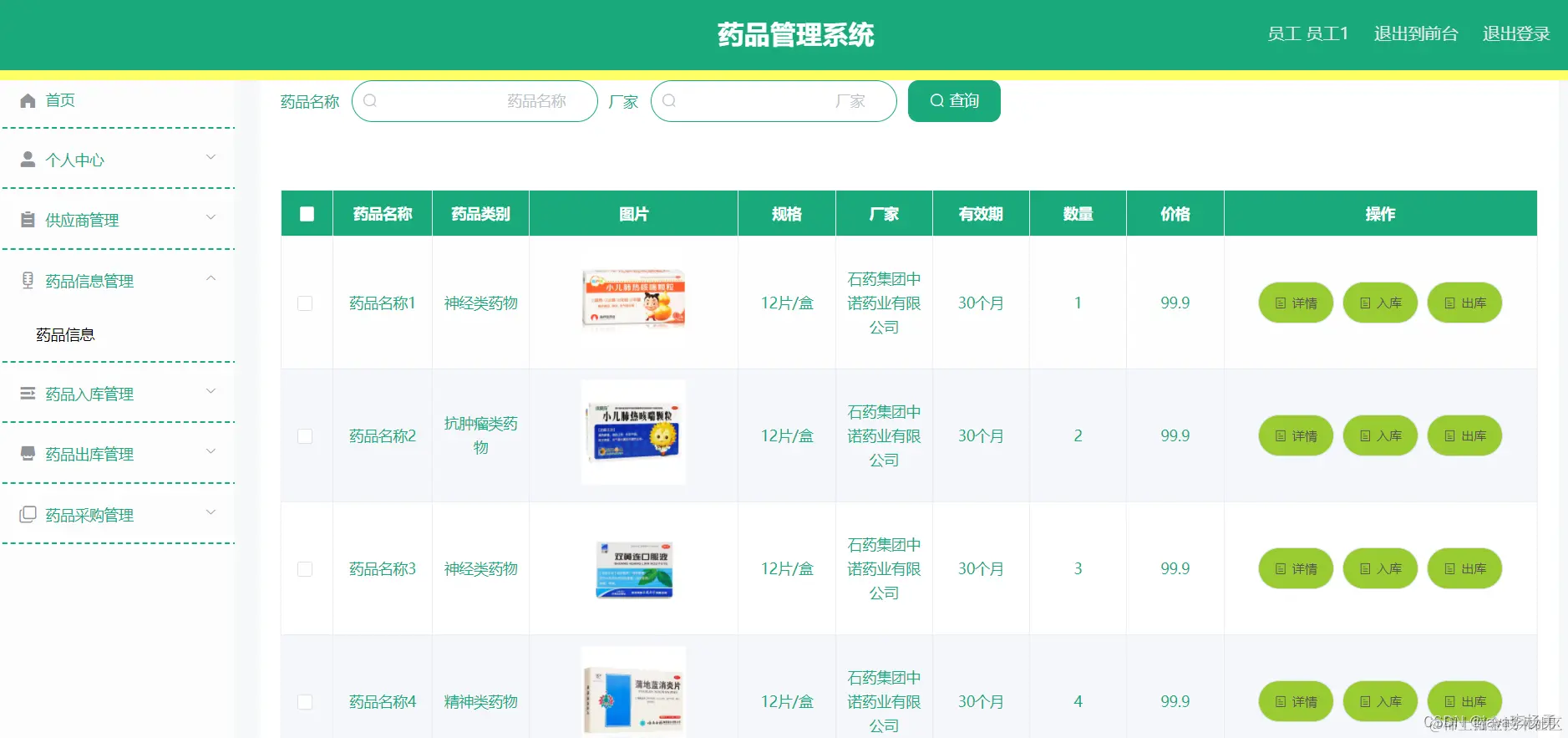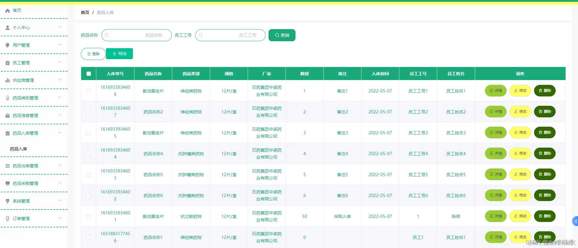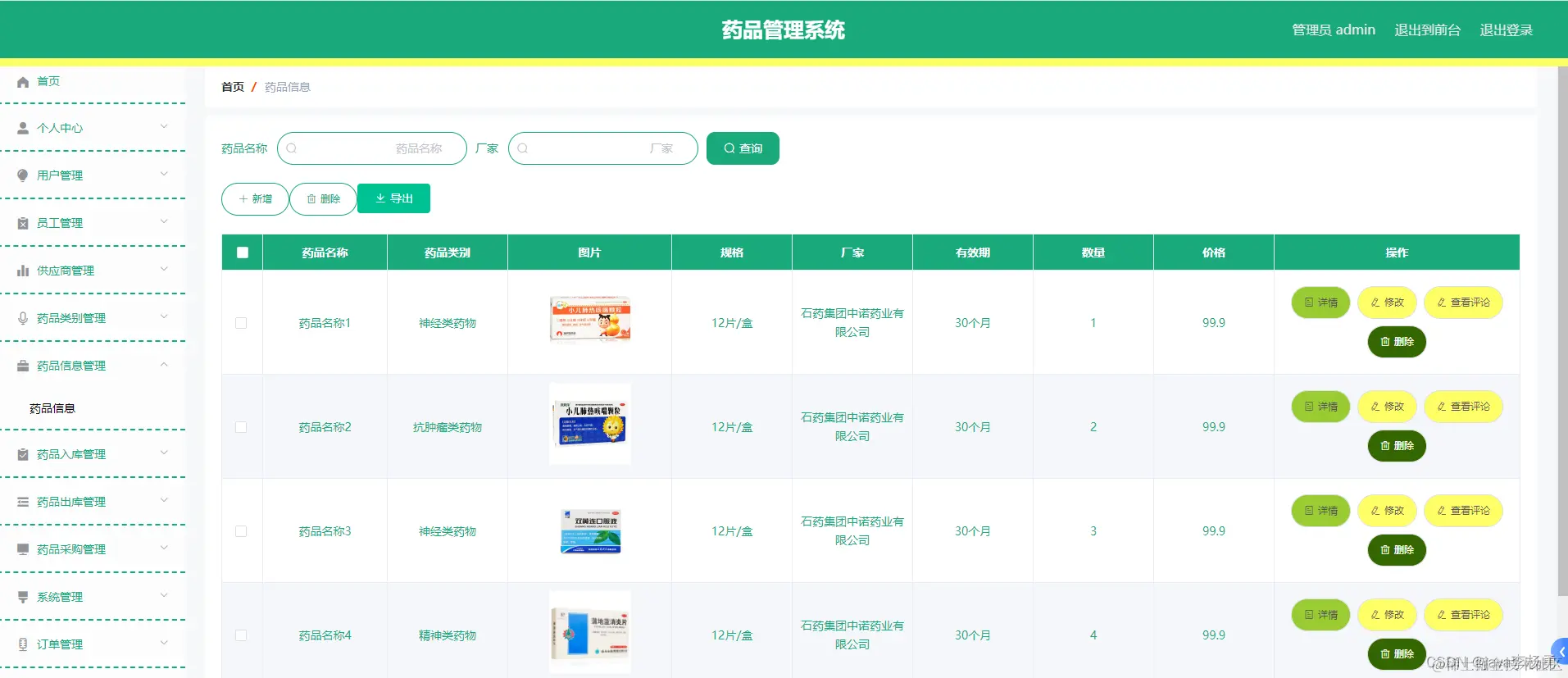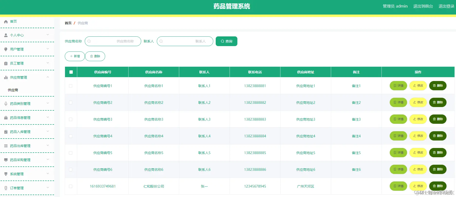 功能完善:可管理主页、个人中心、用户管理、员工管理、供应商管理、药品类别管理、药品信息管理、药品仓储管理、药品出库管理、药品采购管理、系统管理、订单管理等模块的修改和维护。