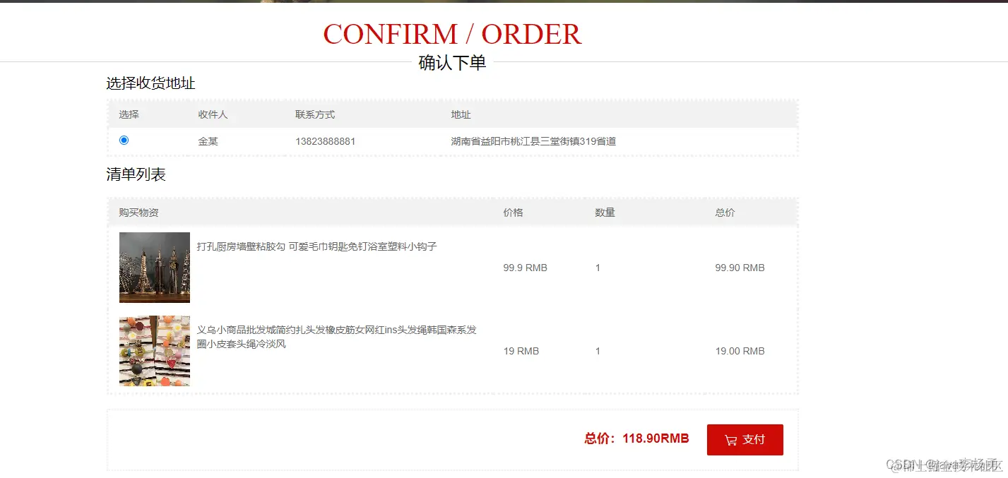在确认下单页面可以查看选择、收件人、联系方式、地址等信息进行