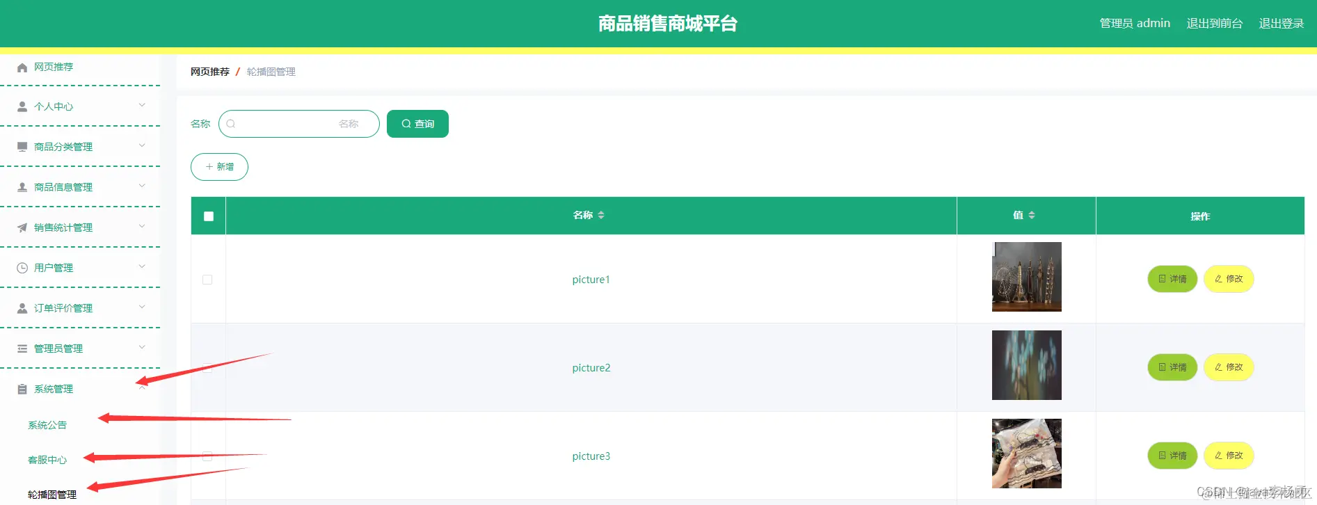 在销售统计管理页面可以查看商品名称、分类、图片、价格、数量、总价格、销售备注等信息,并可根据需要对销售统计管理进行详情,修改,删除或查看详细内容等操作