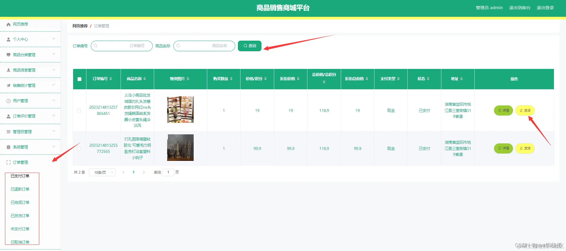 管理员;首页、个人中心、商品分类管理、商品管理、销售统计管理、用户管理、订单评价管理、管理员管理、系统管理、订单管理,
