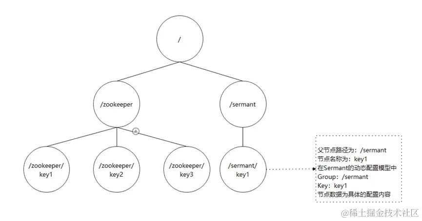 Key(配置项名称):Znode节点的节点名称作为配置项的Key,节点数据作为具体的配置内容。