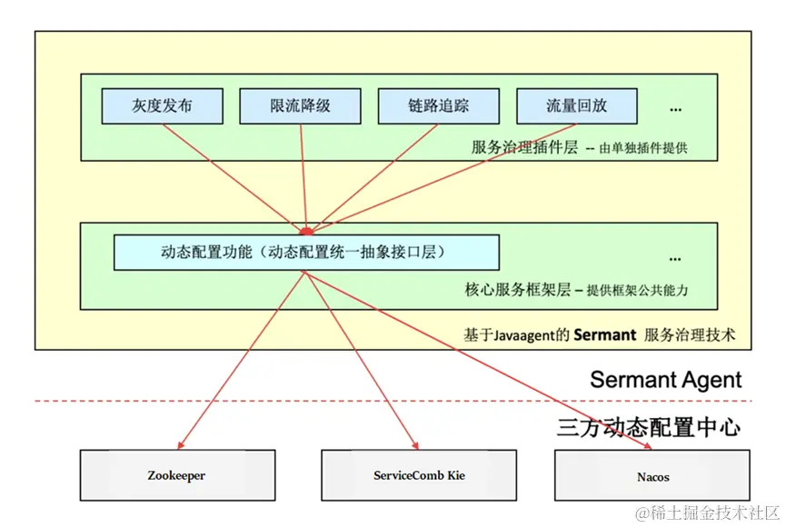 动态配置是Sermant的核心功能之一,可以帮助Sermant统一管理微服务治理能力,例如:灰度发布、限流降级、链路追踪等。如下图所示:
