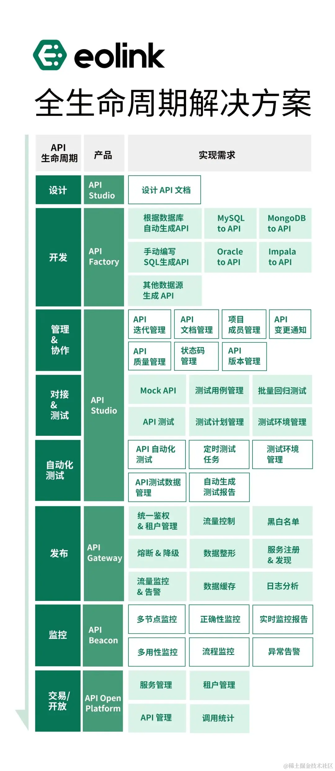 Eolink除了API管理、自动化测试服务以外,还是全球首个API全生命周期管理的SaaS平台,提供包括API网关、API监控、API自动生成等服务。API-First大势所趋,不掌握API全生命周期管理容易掉队!