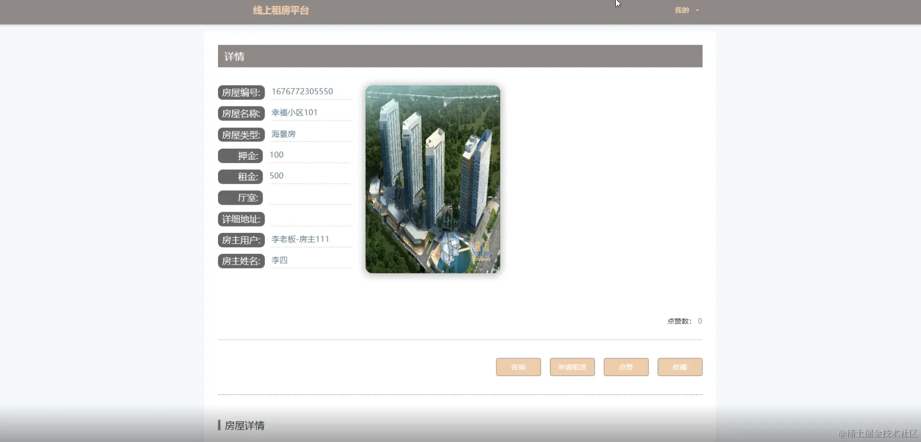 房源信息详情页面可查看房屋名称、房屋类型、房屋编号、押金、租金、厅室、房屋详情、房主姓名等详细信息,可进行在线咨询、租赁申请、点赞、收藏、评论等操作。