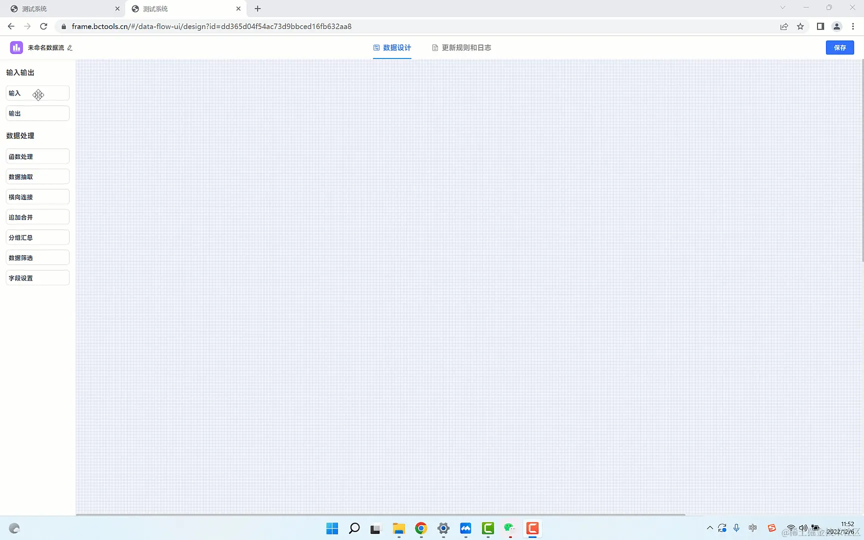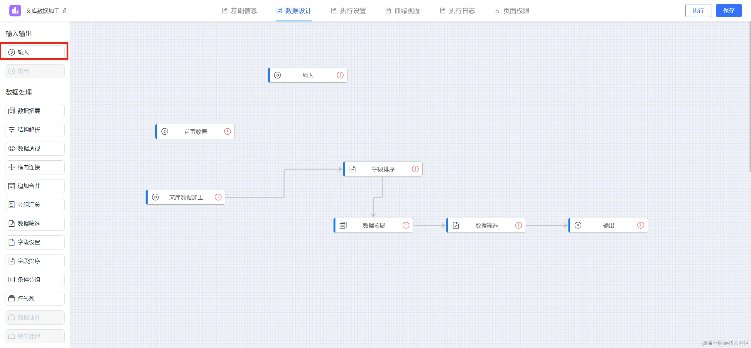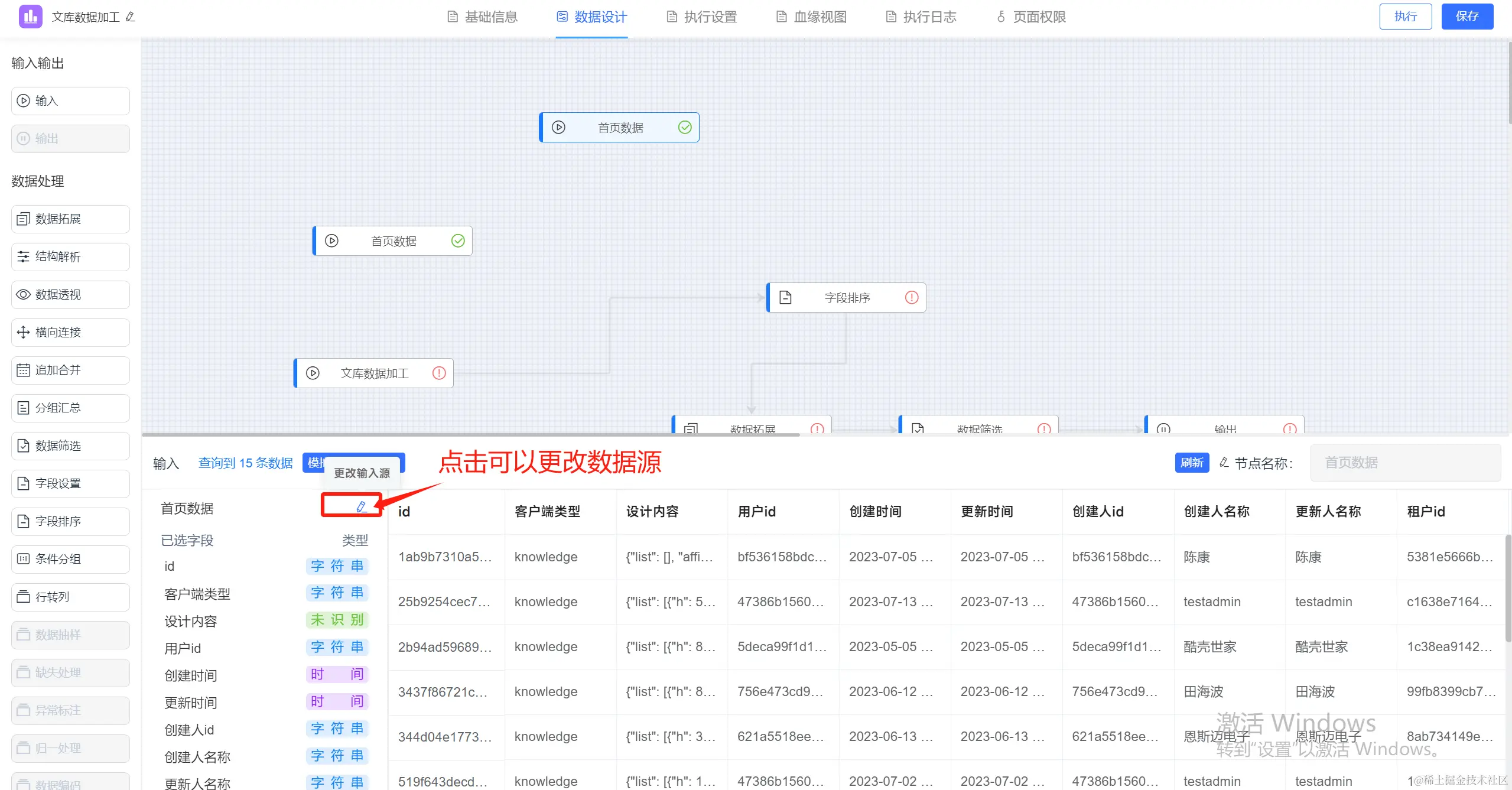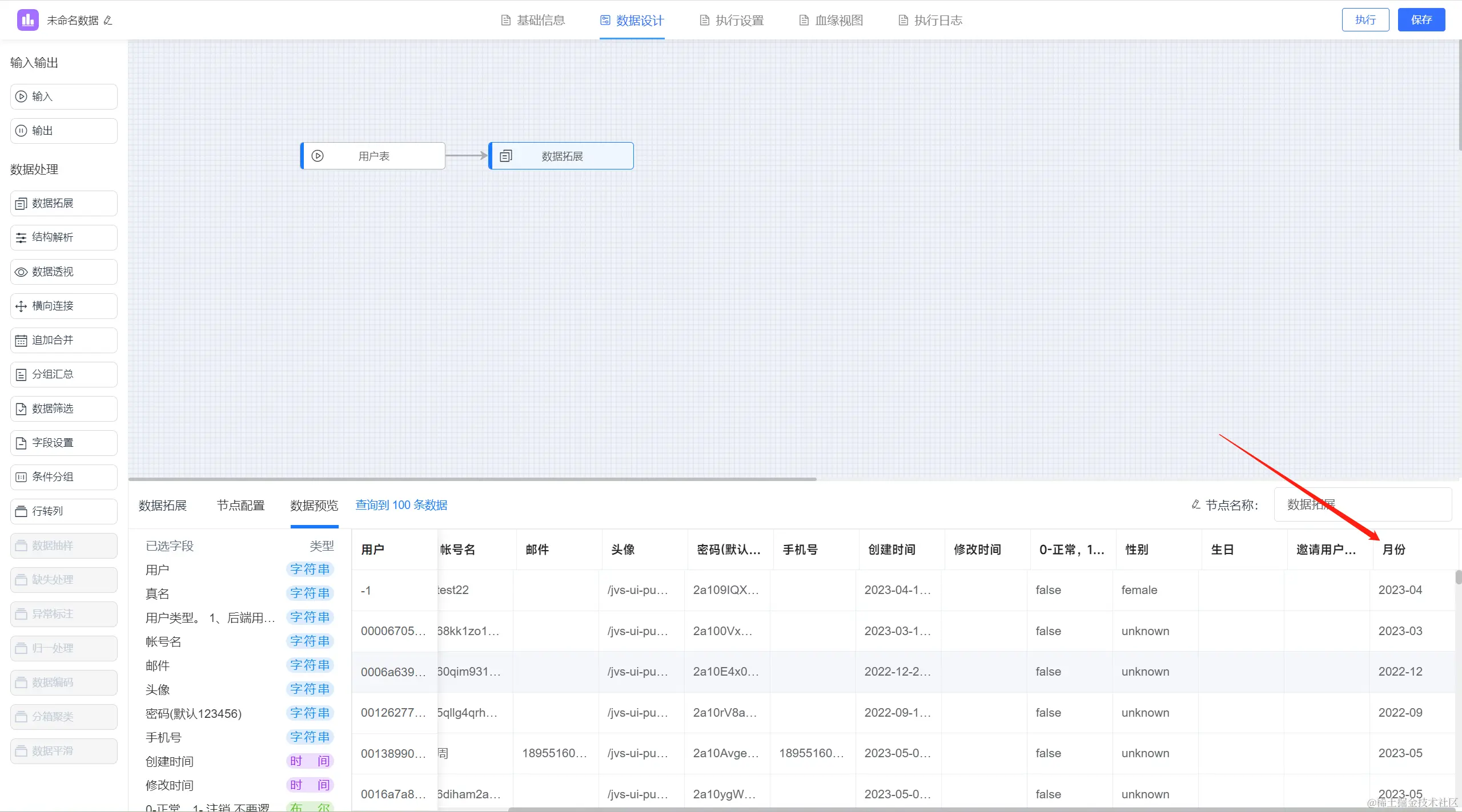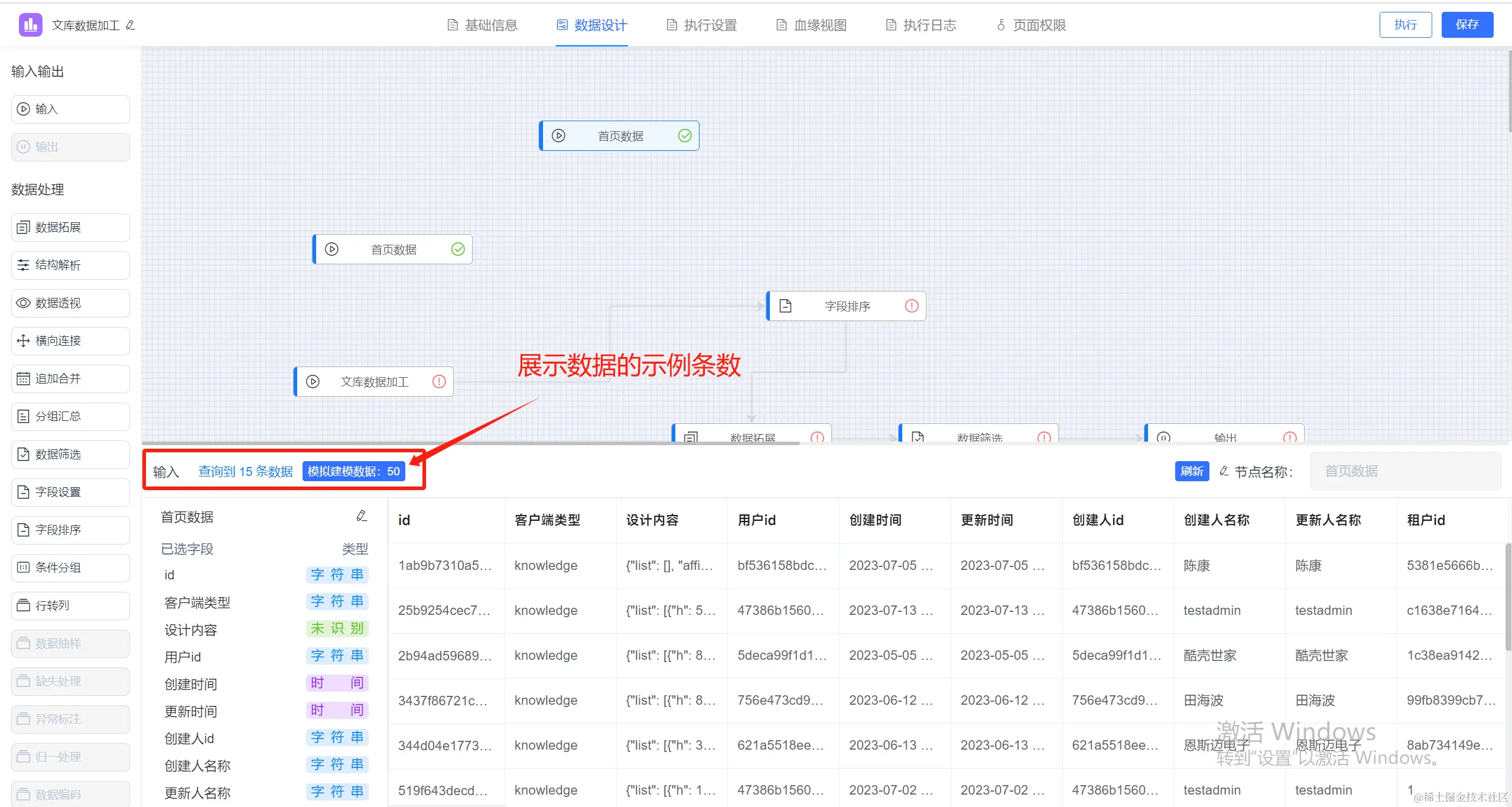 点击选择的数据输入节点,系统下侧展示数据节点的配置界面,左上角展示的数据查询的量(最大只能查询到50条,数据量过大不宜展示),并将选择的数据字段名称与类型,并把对应数据预览出来,如下图所示