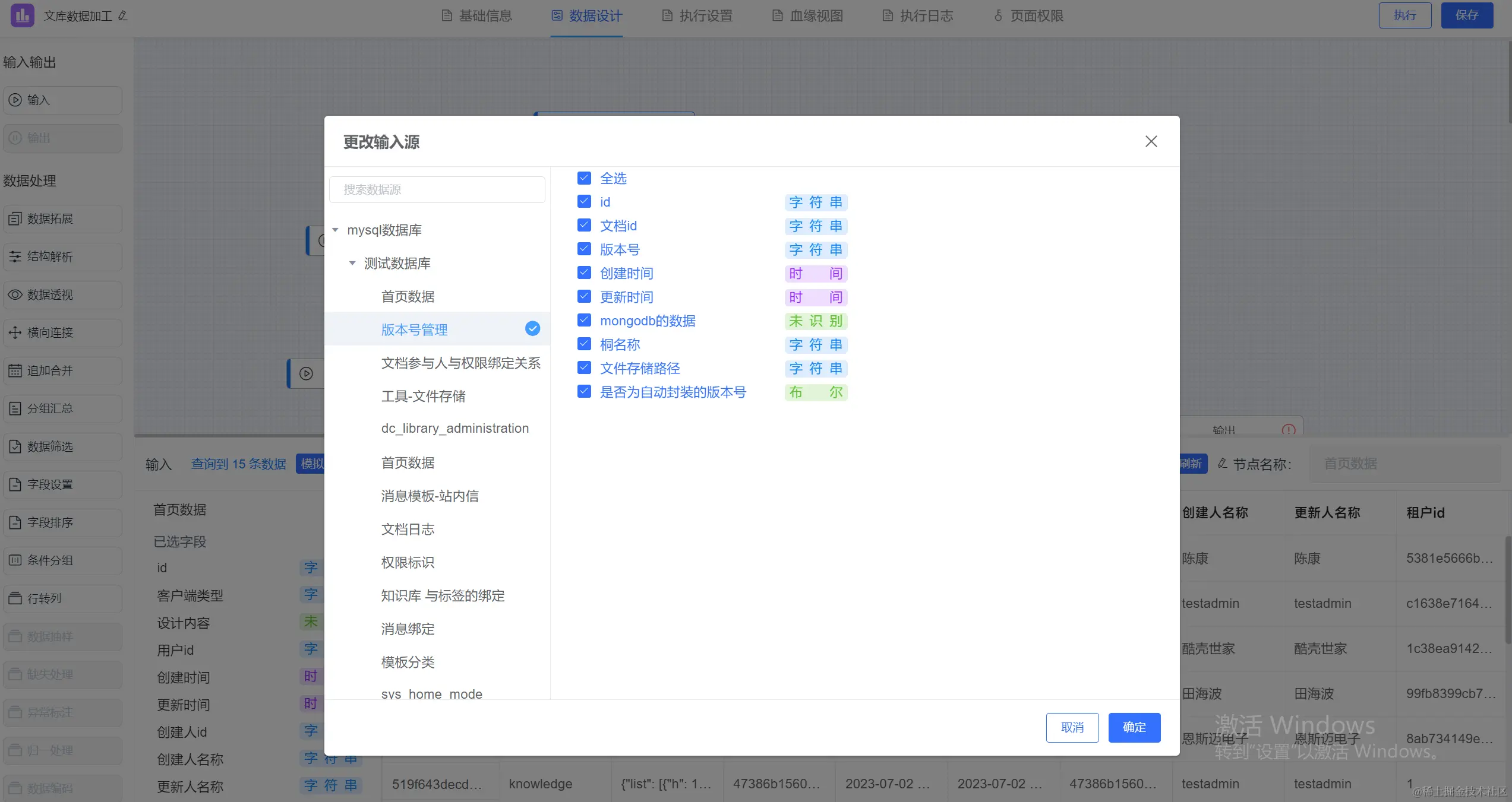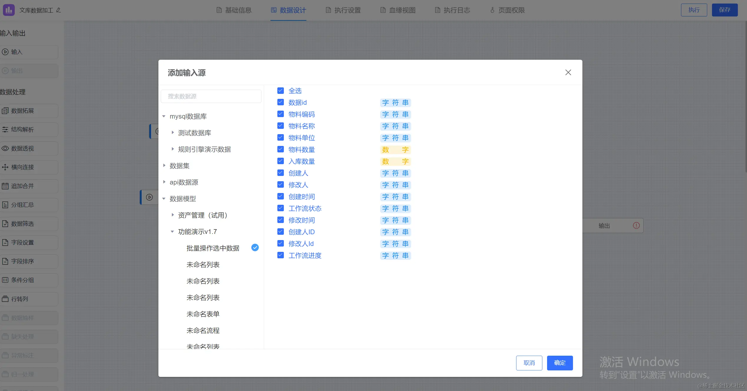 输入节点是数据集设计的数据引入的开始节点,用来选择要处理的数据源。在选择数据源时,将输入节点拖入数据集设计画布,系统将自动弹出数据源的选择弹框,选择对应的数据源后,可以自由勾选所需的字段。