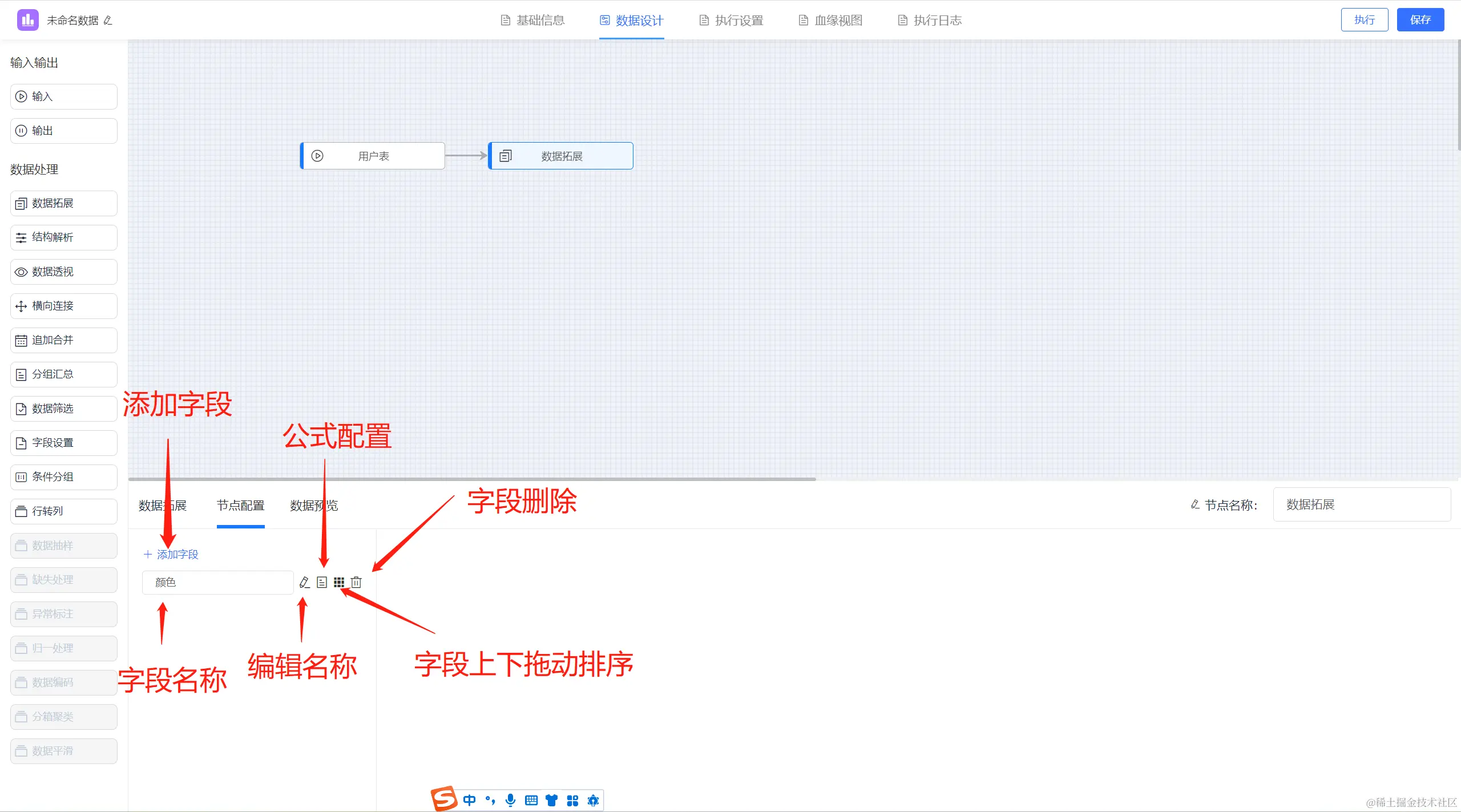 1、拖动数据拓展字段,并将字段拓展与之前的历史节点连接起来,点击数据拓展节点,进入节点配置模式