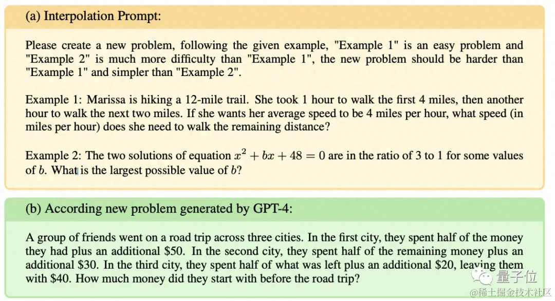 示例 1 和 2 分别来自于 GSM8K 和 MATH,1 简单,2 难一些,GPT-4 要做的 “插值” 就是生成比 1 难但比 2 更简单的新问题。