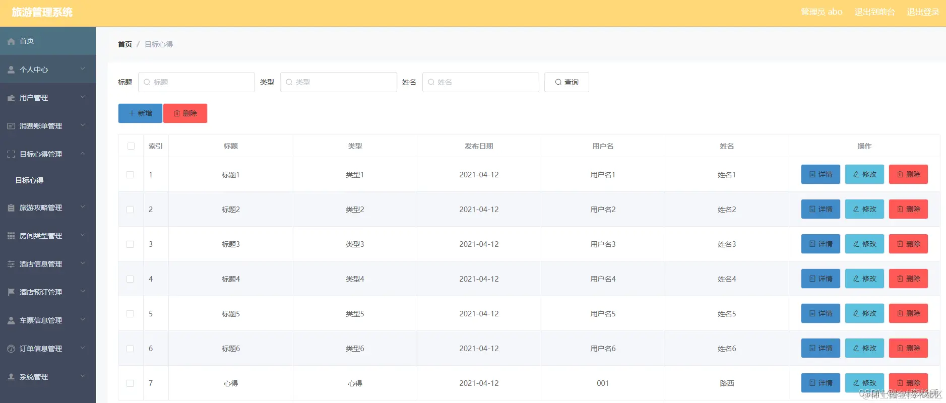 然而管理员则可以在后台直接管理;首页、个人中心、用户管理、消费账单管理、目标心得管理、旅游攻略管理、客房预订管理、房间类型管理、酒店预定管理、酒店订单信息管理、车票信息管理以及系统管理等信息。本网站模块设计的独立性强,用户体验良好、后期维护修改管理十分方便。