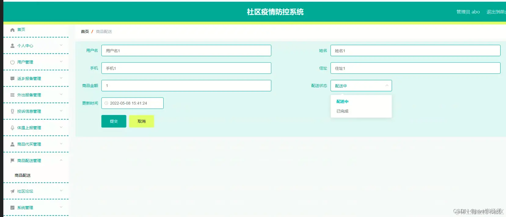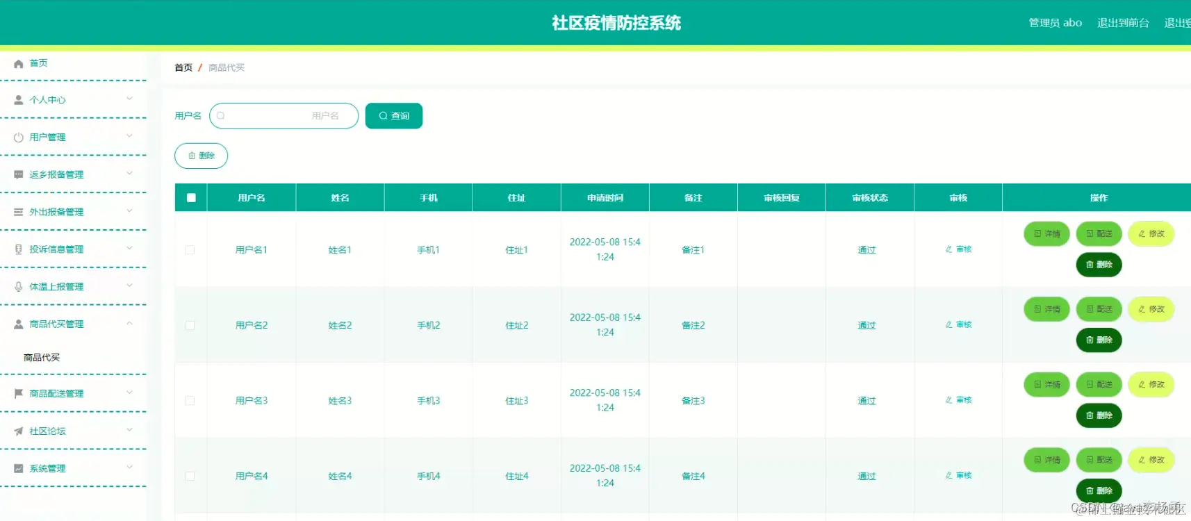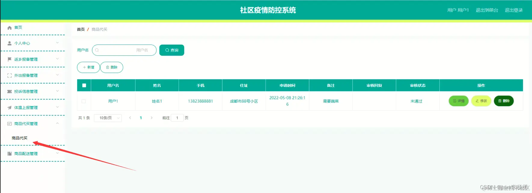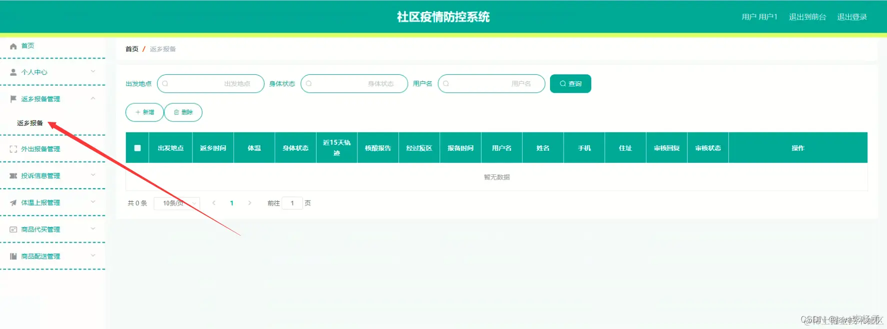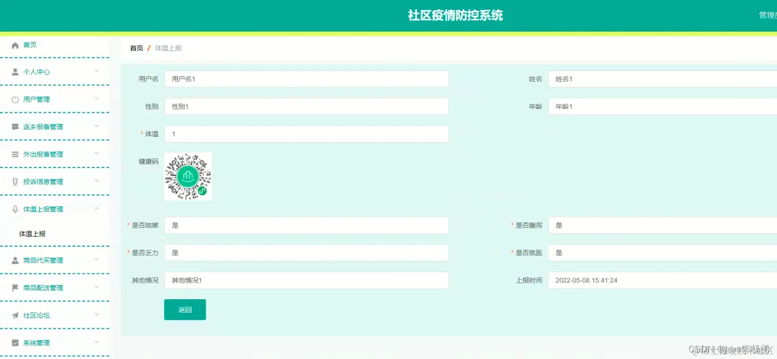 用户登录进入社区疫情防控系后台统可以查看首页、个人中心、返乡报备管理、外出报备管理、投诉信息管理、体温上报管理、商品代买管理、商品配送管理等内容进行详细操作