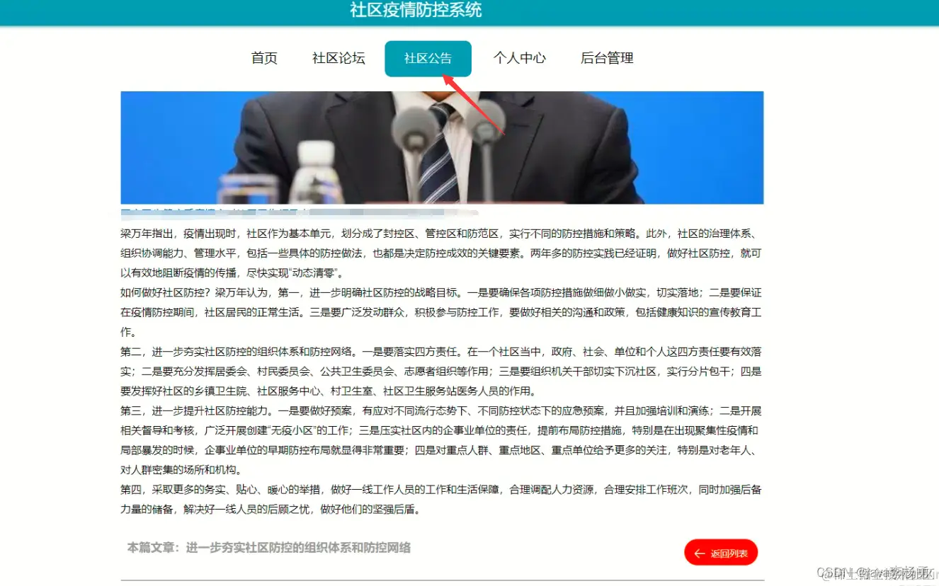 查看疫情公告信息:首先根据登录进入到社区疫情防控管理平台,点击首页详情可查看疫情公告相关内容信息等操作