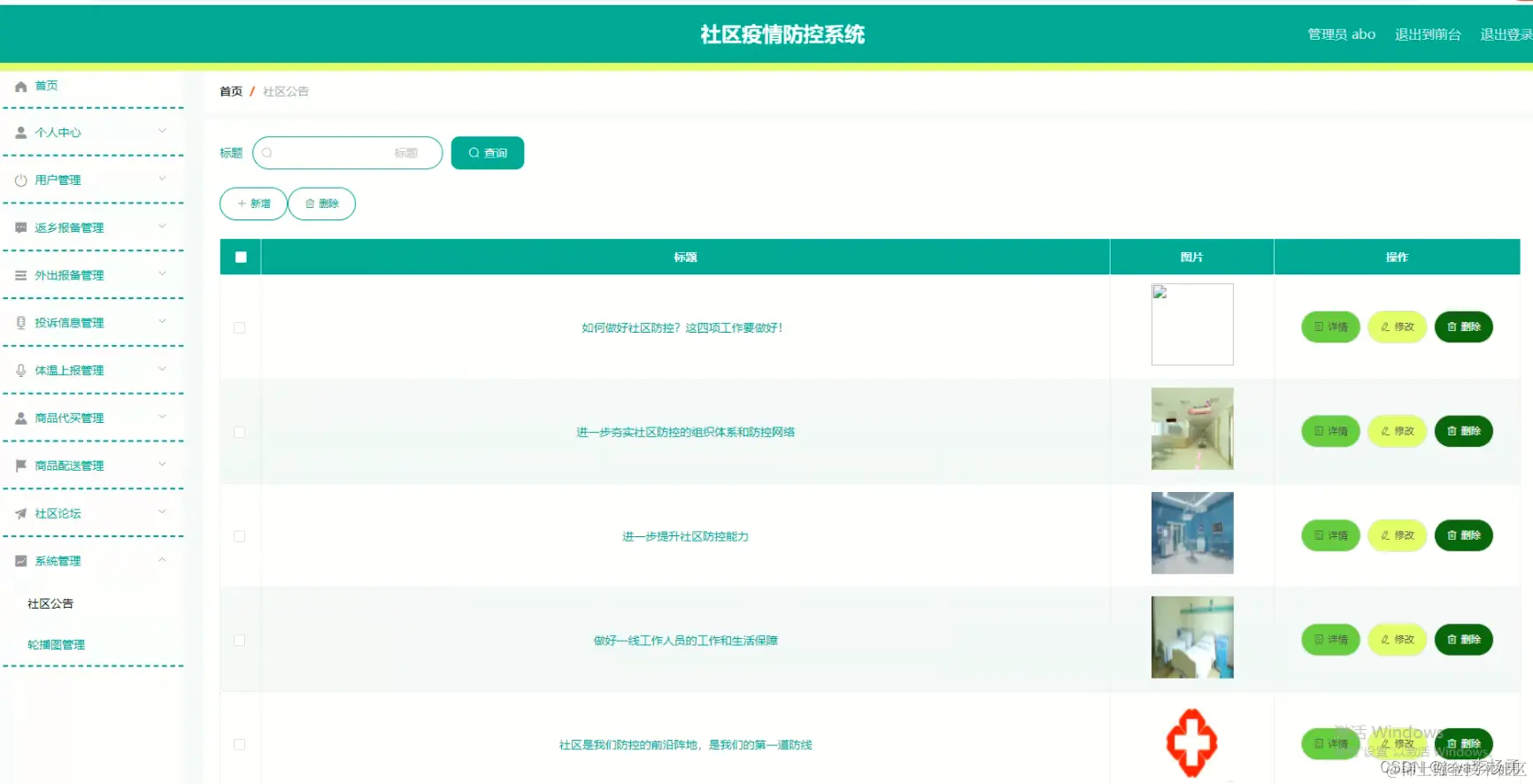 (9)社区疫情公告信息(主键id、创建日期、标题名称、简介、图片信息内容)