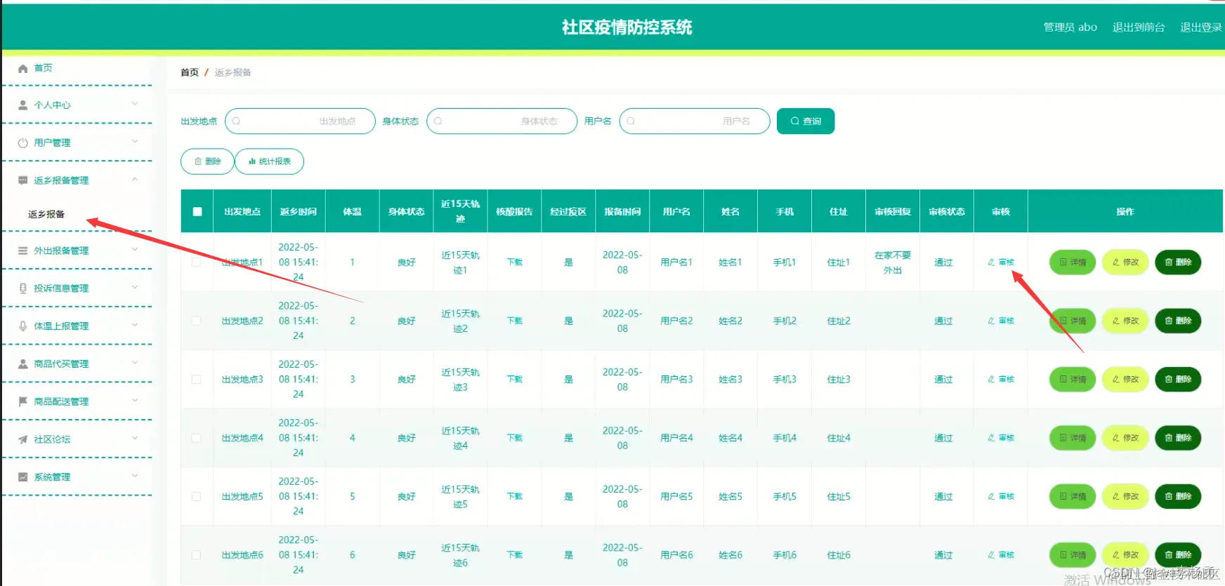 在返乡报备管理页面可以对出发地点、返乡时间、体温、身体状态、近15天轨迹、核酸报告、经过疫区、报备时间、用户姓名、姓名、用户手机、详细住址、审核回复、审核状态、审核等信息进行详情,修改或删除等操作