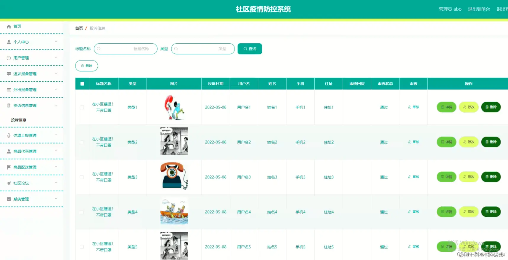 在投诉信息管理页面可以对标题名称名称、类型、图片信息、投诉日期、用户姓名、姓名、用户手机、详细住址、审核回复、审核状态、审核等信息进行详情,修改或删除等操作