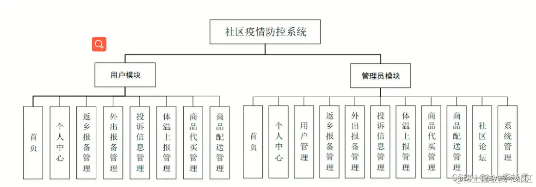 系统架构图属于系统设计阶段,系统架构图只是这个阶段一个产物,系统的总体架构决定了整个系统的模式,是系统的基础。系统不仅要求功能完善,而且还要界面友好,因此,对于一个成功的系统设计,功能模块的设计是关键。由于本系统可执行的是一般性质的社区疫情管理工作,本系统具有一般适用性,其所实现的功能满足社区对日常社区疫情管控工作的管理,方便用户之间的沟通。系统设计的图像的数据流分析阶段的需要结构化设计的概要说明的基础上,根据映射到软件体系结构的某些程序。首先,整个系统分成几个小的模块,小的问题,然后,进一步细分模块,添加细节。据社区疫情防控管理平台系统的需求分析,确定此系统分为前台显示和后台管理两类。前台显示模块分为社区疫情浏览、社区疫情搜索、留言板等几个模块,主要功能模块为:首页、个人中心、用户管理、返乡报备管理、外出报备管理、投诉信息管理、体温上报管理、商品代买管理、商品配送管理、社区论坛、系统管理等几个模块的操作、社区疫情防控管理平台系统的整体结构设计如图所示。