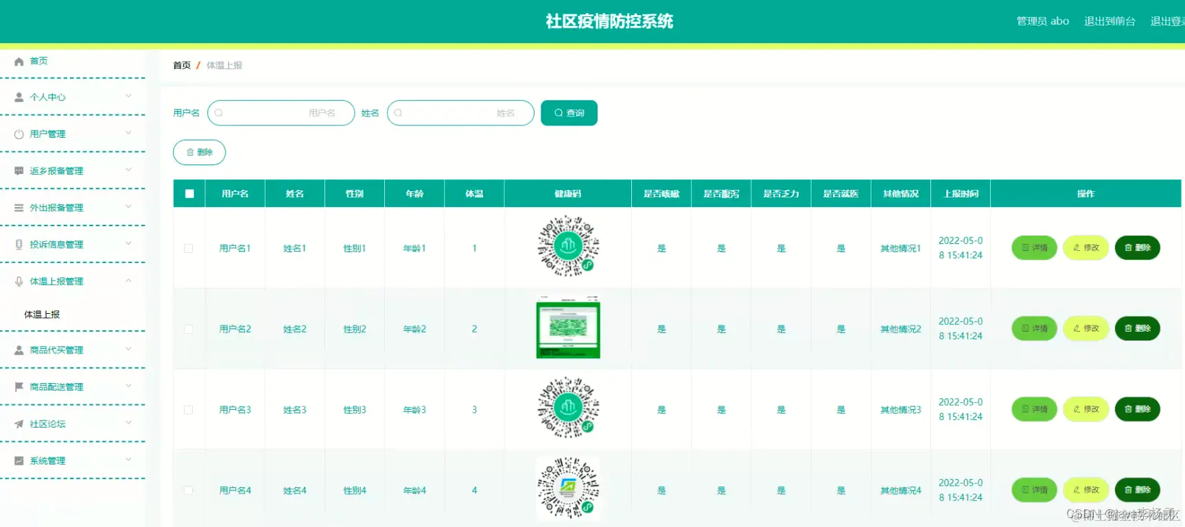 在体温上报管理页面可以对用户姓名、姓名、性别、年龄、体温、健康码、是否咳嗽、是否腹泻、是否乏力、是否就医、其他情况、上报时间等信息进行详情,修改或删除等操作