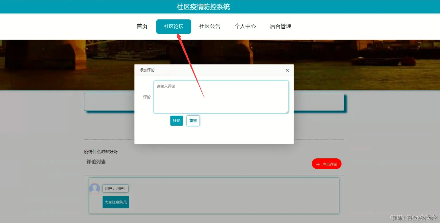 用户输入进入到系统首页可以查看首页、社区论坛、社区公告、个人中心、后台管理等内容进行操作,系统首页不用登录。
