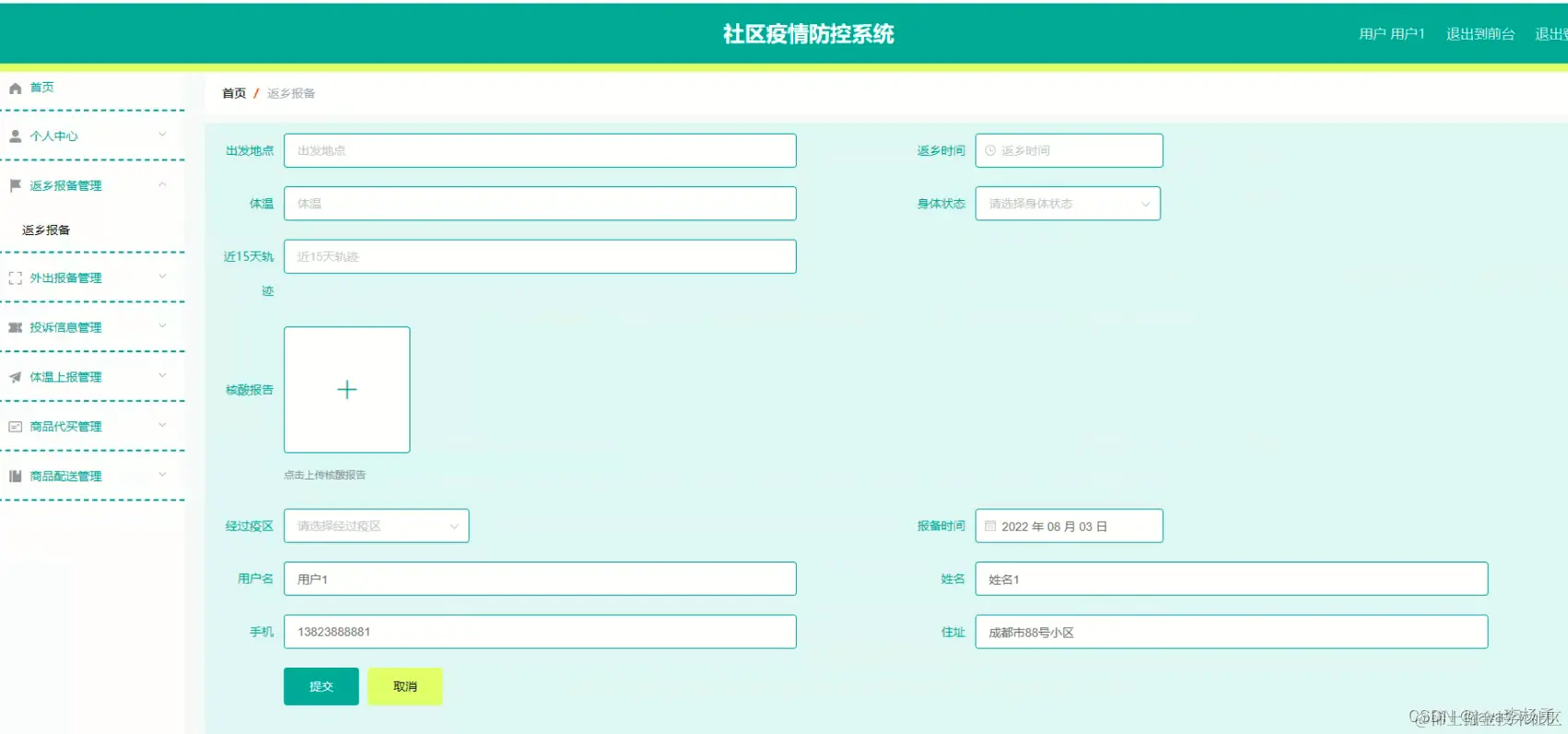 返乡报备信息管理:用户可以进行外出报备信息(出发地点、返乡时间、体温、身体状态、近15天轨迹、核酸报告、经过疫区、报备时间、用户姓名、姓名、用户手机、详细住址、是否审核、审核回复)以及查看返乡报备信息等。