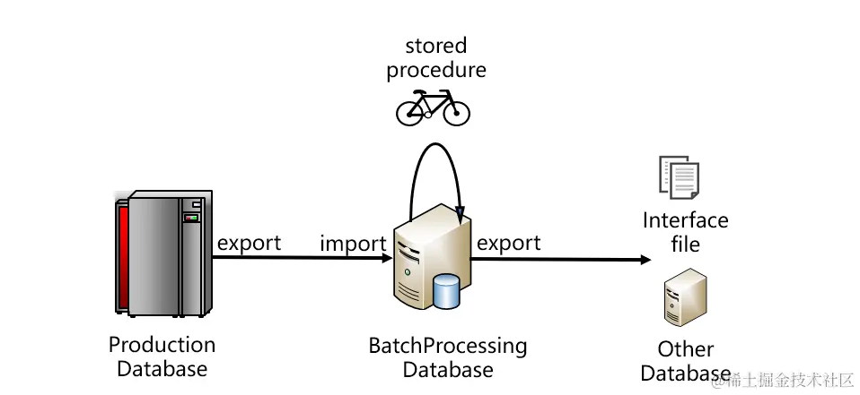 从图上看,数据要从生产数据库取出,存入跑批数据库。跑批数据库通常是关系型的,编写存储过程代码完成跑批计算。跑批的结果一般不会直接使用,而是再从跑批数据库中导出,采用接口文件的方式提供给其他系统,或者再导入其他系统数据库。这是比较典型的架构,图中的生产数据库也可能是某个中央数据仓库或者Hadoop等。一般情况下,生产库和跑批库不会是同一种数据库,它们之间往往通过文件的方式传递数据,这样也比较有利于降低耦合度。跑批计算完成后,结果要给多个应用系统使用,一般也都是以文件方式传递。