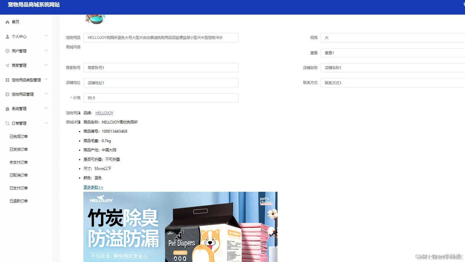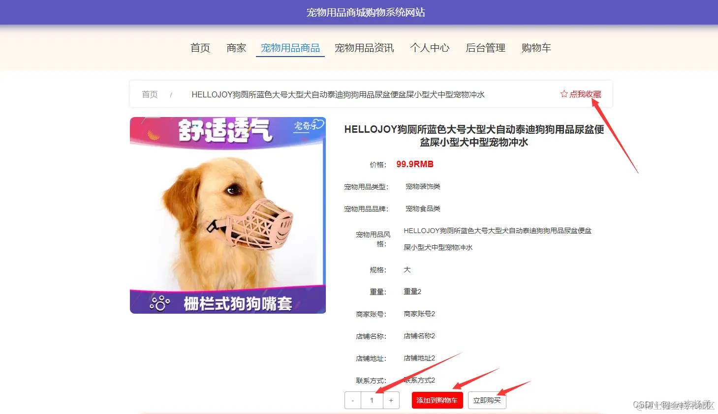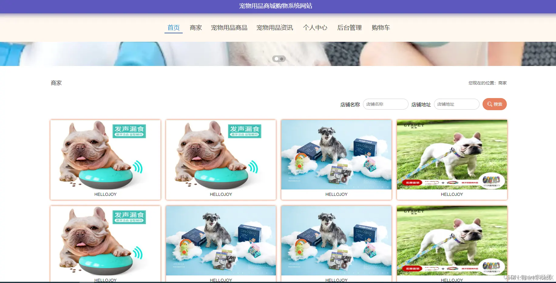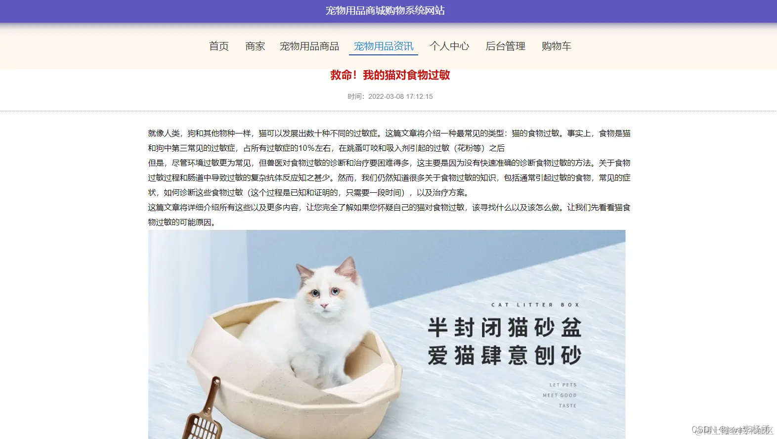 前端默认首页地址是显示宠物用品资讯信息,点击可以查看详情资讯。首页主要功能是用户宠物用品商家的查看,商品信息,详情 ,购物车,订单,购买,收藏,评论等操作都是可以的。