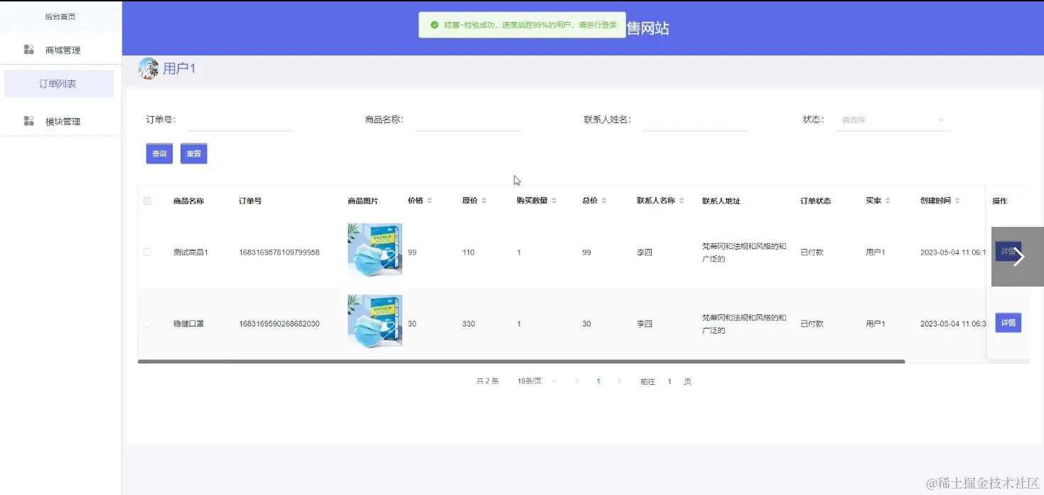 用户在购买商品时,点击商品信息页面的“立即购买”或购买记录页面的“去结算”,跳转到订单生成页面,在订单生成页面用户需要确认收货地址、收货人手机号、收货人姓名等信息,确认无误后点击“提交订单”,订单提交成功,生成一条订单信息。