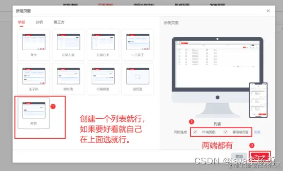 建模这里我们需要选择页面,不过我们就创建了一个实体,所以就选择列表吧,从示例页面中我们能看到可以同时生成PC与移动两个端的页面呢,点上后点击下一步。