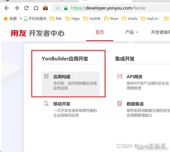 产品首页中的产品里面我们在第一个位置上就看到了一个叫做【YonBuilder】的低代码应用开发构建,这里写的词还有一个无代码,我就好奇了,所以我们来试试