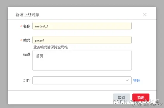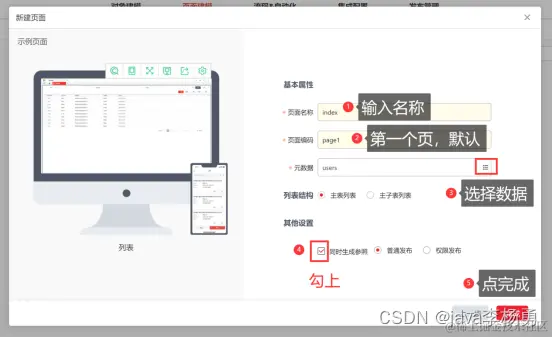 新建页面的最后一个步骤,需要输入页面的名称以及元数据,这个元可以理解成源,也就是我们创建的实体表。我们用普通发布就可以了,最后点击完成。