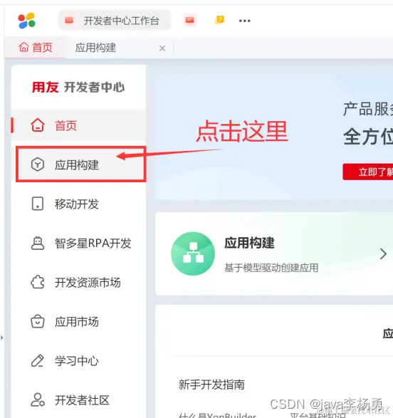 我们在首页左侧菜单中很明显的能看到【应用构建】四个大字,直接点就行。
