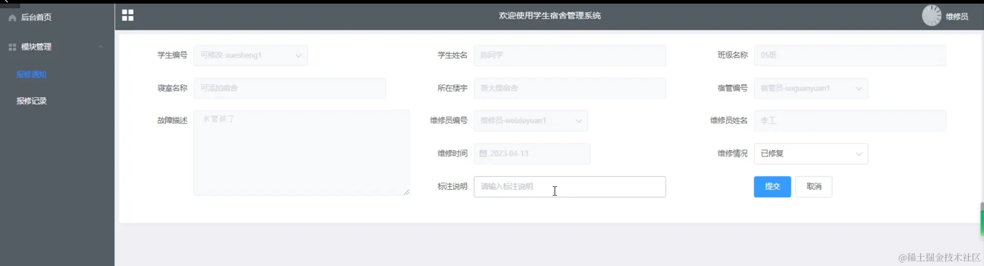 报修通知,在报修通知页面中可以查看学生提交的报修申请,并提交维修情况和标注说明。如图5-14所示。