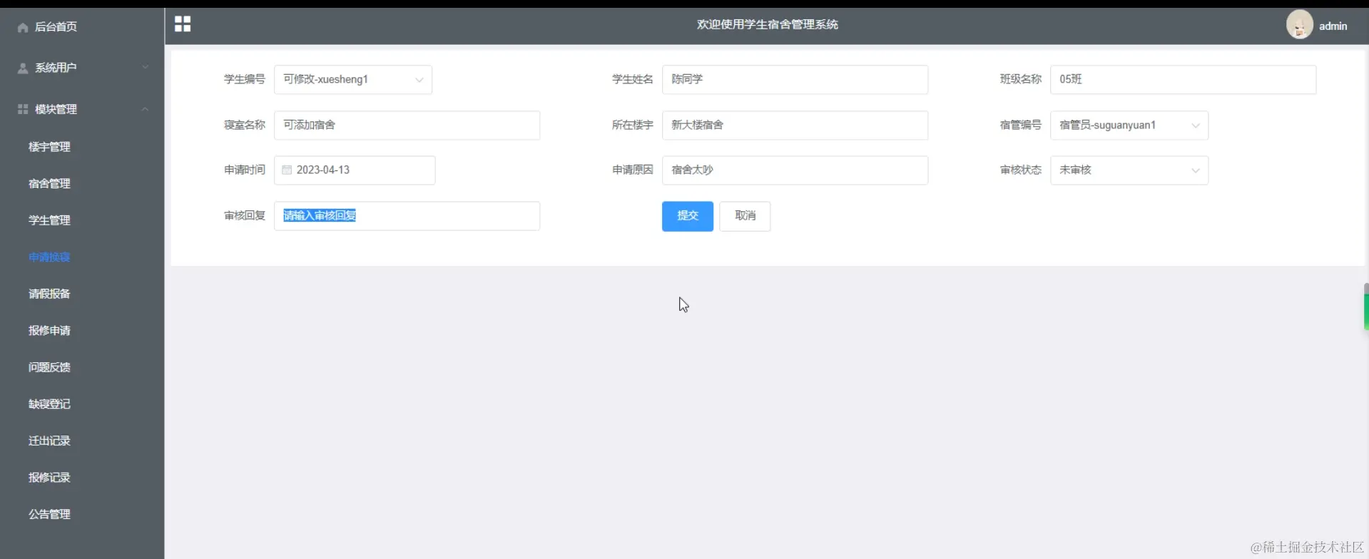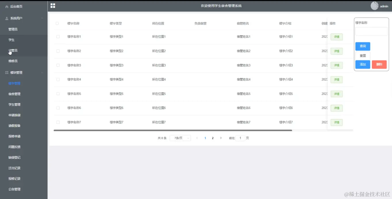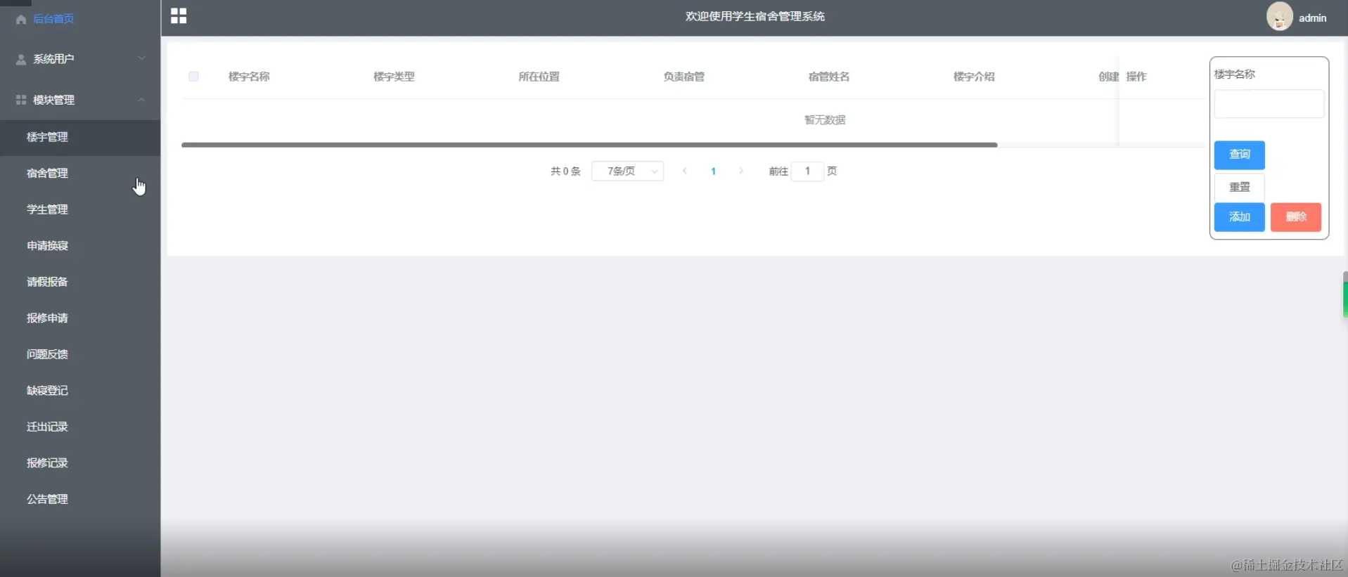(1)管理员模块:系统中的核心用户是系统管理员,管理员登录后,通过管理员菜单来管理系统。主要功能有:首页、系统用户(管理员、学生、宿管员、维修员)、楼宇管理、宿舍管理、学生管理、申请换寝、请假报备、报修申请、问题反馈、缺寝登记、迁出记录、报修记录、公告管理等功能。
