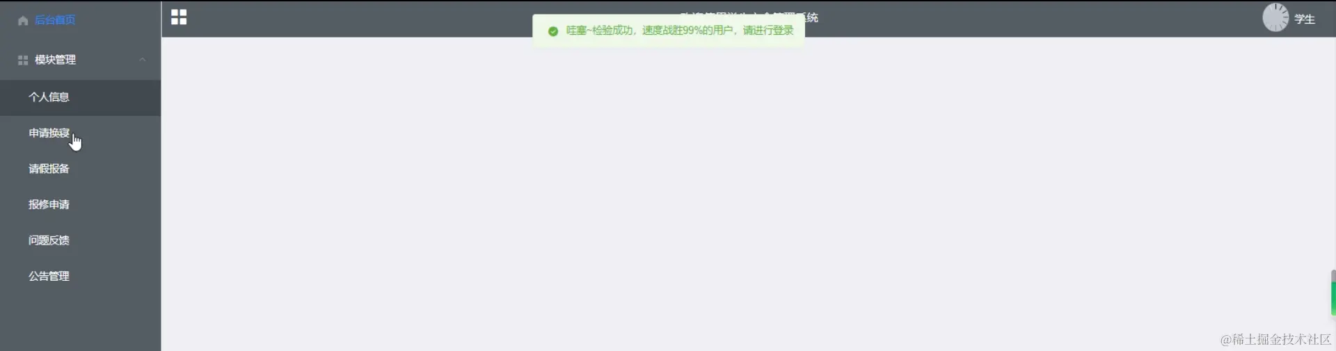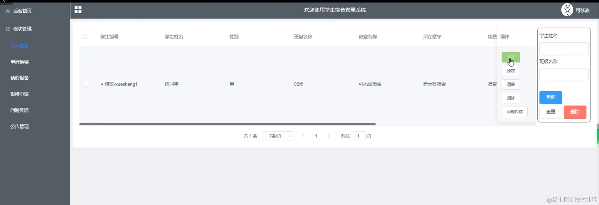 (2)学生:首页、个人信息、申请换寝、请假报备、报修申请、问题反馈、公告管理等功能。