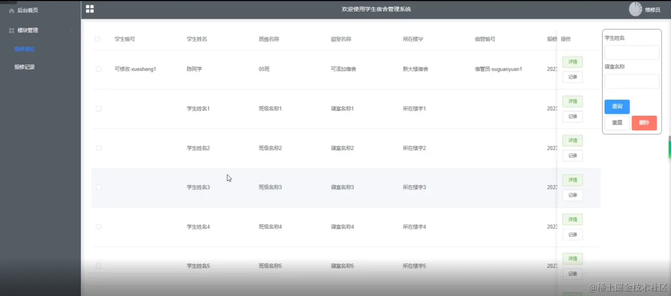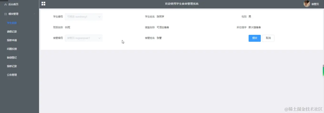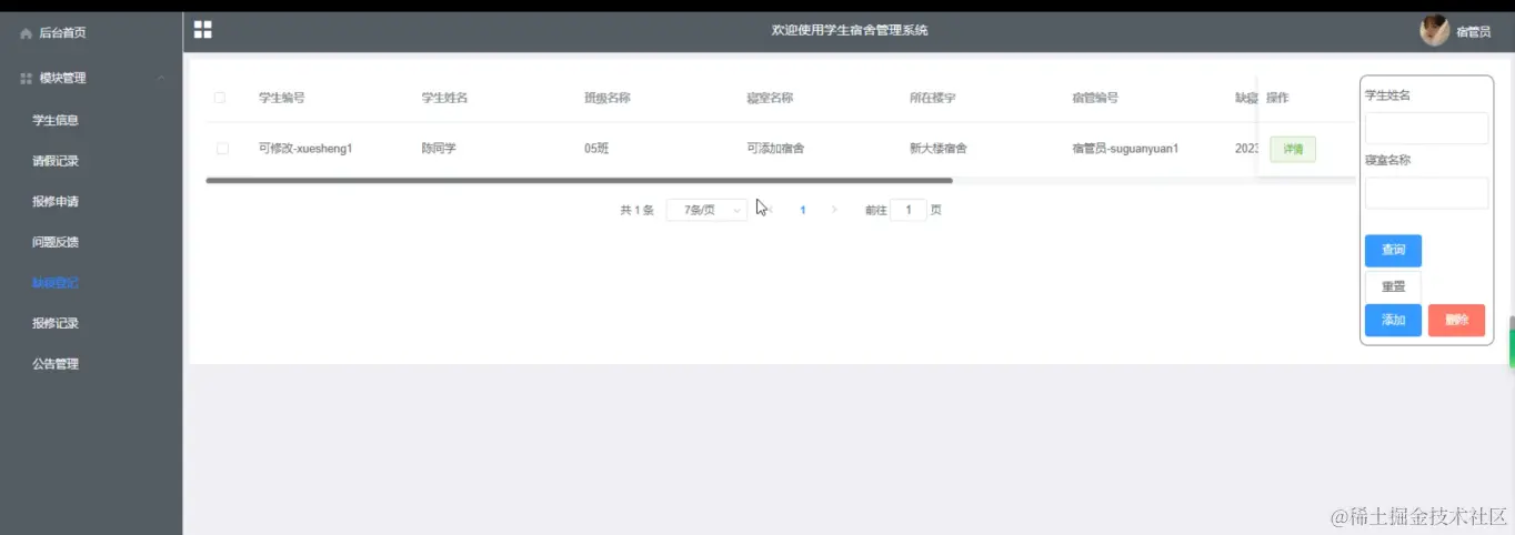 (3)宿管员:首页、学生信息、请假记录、报修申请、问题反馈、缺寝登记、报修记录、公告管理等功能。
