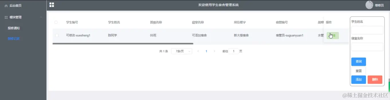 报修记录,在报修记录页面中可以查看学生编号、学生姓名、班级名称、寝室名称、所在楼宇、宿管编号、故障描述、维修员姓名、维修时间、维修情况等信息,并可进行查询、添加、删除等操作。如图5-15所示。