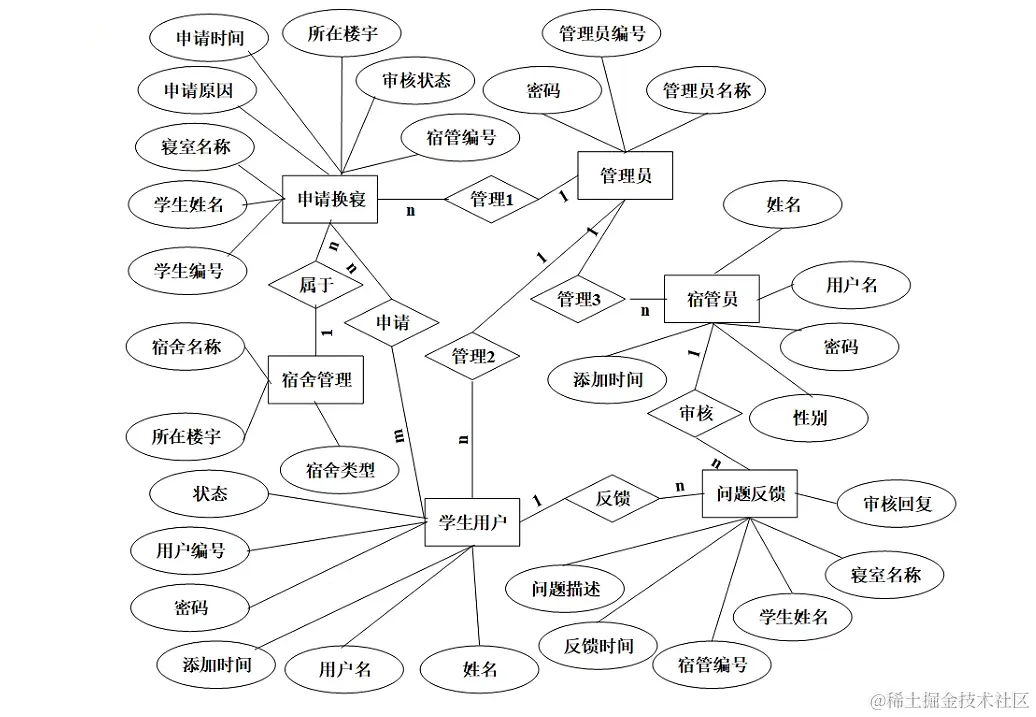本学生宿舍管理系统采用的是mysql数据库,数据存储快,因为学生宿舍管理系统,主要的就是对信息的管理,信息内容比较多,这就需要好好的设计一个好的数据库,分类要清楚,不能添加信息的时候,造成信息太过混乱,设计好的数据库首先就需要先把各个实体之间的关系表达明确,系统的E-R图如下图所示: