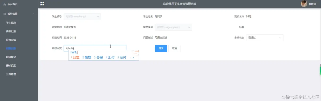 问题反馈,宿管员可在问题反馈页面查看学生提交的的问题反馈信息详情,并对问题反馈进行审核回复,如图5-8所示。