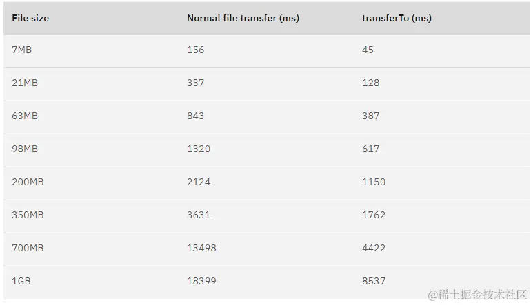 如果 Linux 系统支持 sendfile() 系统调用,那么 transferTo() 实际上最后就会使用到 sendfile() 系统调用函数。曾经有大佬专门写过程序测试过,在同样的硬件条件下,传统文件传输和零拷拷贝文件传输的性能差异,你可以看到下面这张测试数据图,使用了零拷贝能够缩短 65% 的时间,大幅度提升了机器传输数据的吞吐量。