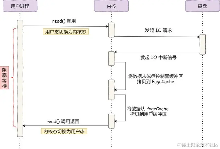 - 最后,内核再把 PageCache 中的数据拷贝到用户缓冲区,于是 read 调用就正常返回了。