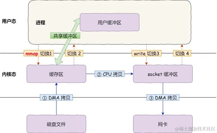 传统 IO 的工作方式,从硬盘读取数据,然后再通过网卡向外发送,我们需要进行 4 上下文切换,和 4 次数据拷贝,其中 2 次数据拷贝发生在内存里的缓冲区和对应的硬件设备之间,这个是由 DMA 完成,另外 2 次则发生在内核态和用户态之间,这个数据搬移工作是由 CPU 完成的。