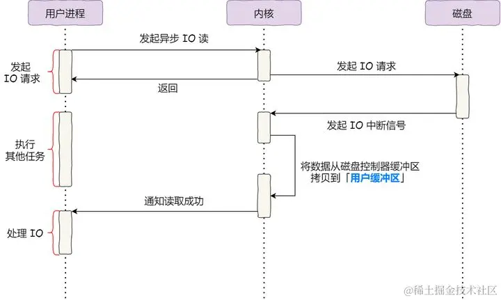 - 前半部分,内核向磁盘发起读请求,但是可以不等待数据就位就可以返回,于是进程此时可以处理其他任务;