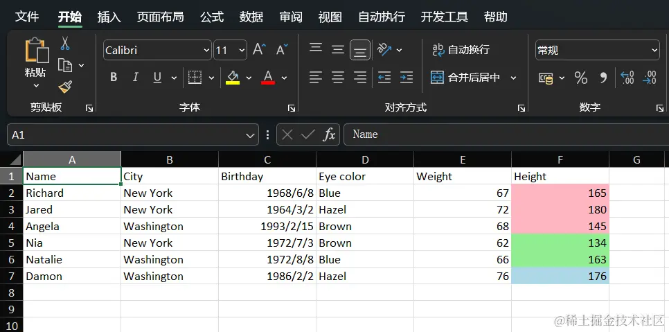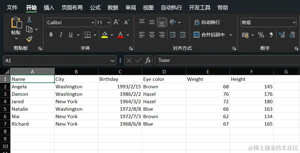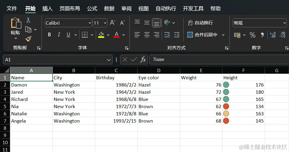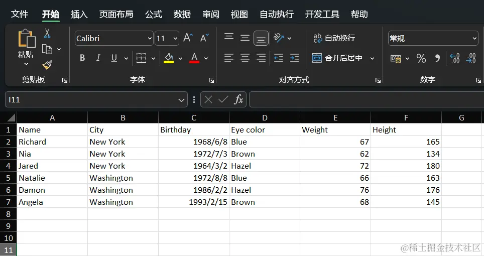 {"Name", "City", "Birthday", "Eye color", "Weight", "Height"},