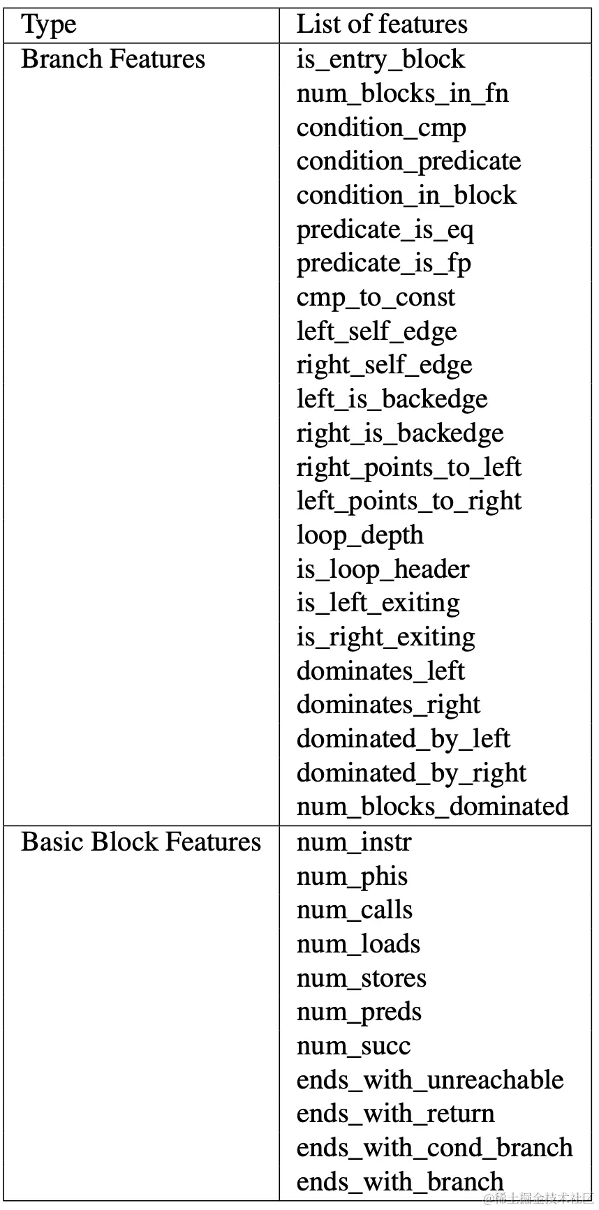 在本例中,代码片段特征取自程序的syntax,需要记录的特征取自下表。特征被向量化后用于生成预测。