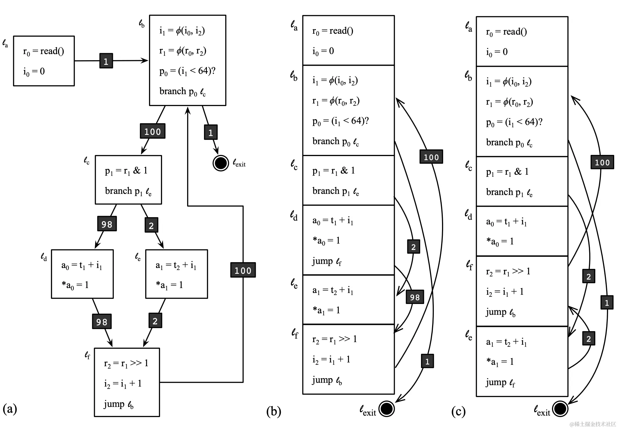 (a) 一个以CFG表示的有分支的程序片段(黑框中的文字为branch被选择执行的频率);(b)和(c)表示了两种不同的placement,cost分别为1+2+98+100=201和1+2+2+100=105。本土取自Vespa的论文