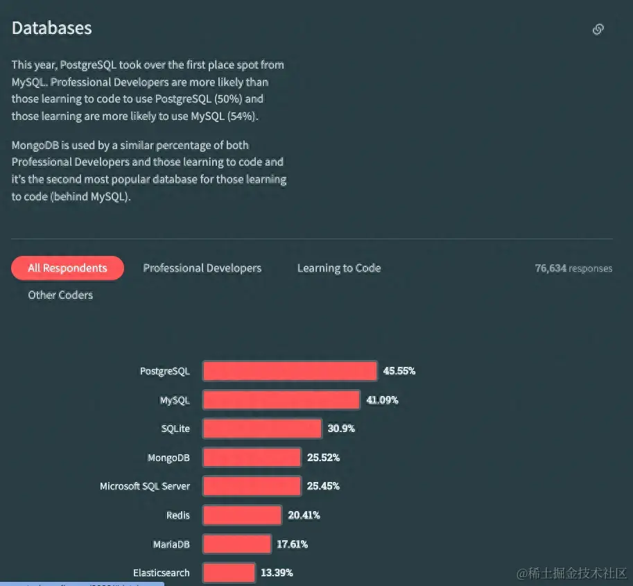 根据 2023 年 Stack Overflow 调研,Postgres 已经取代 MySQL 成为最受敬仰和渴望的数据库。