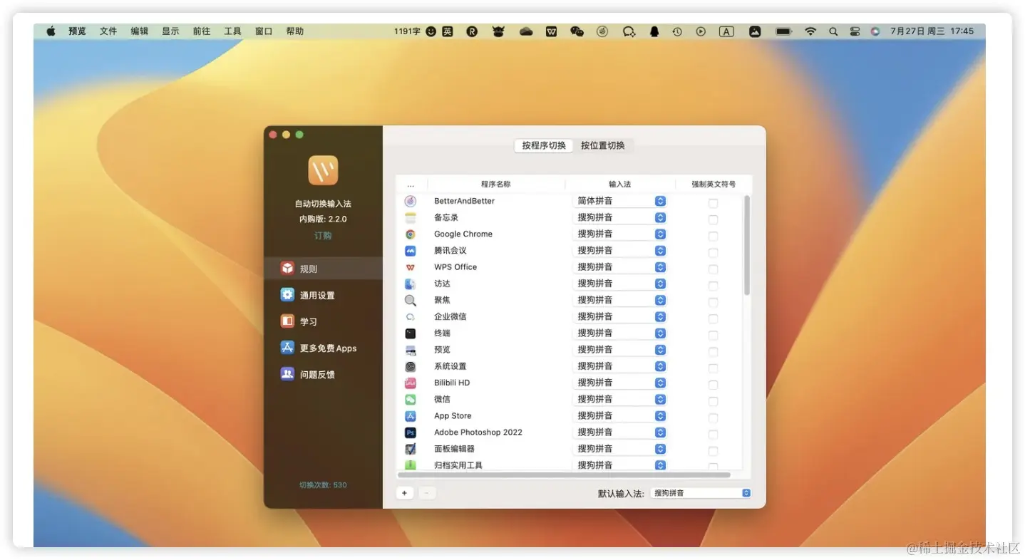 但是,追求效率(懒到不行)的我们并不满足于快捷键,我们想让 Mac 跟我们心有灵犀:当我们打开某个 App 时,它可以自动切换成我们想要的输入法。这个想法可以实现吗